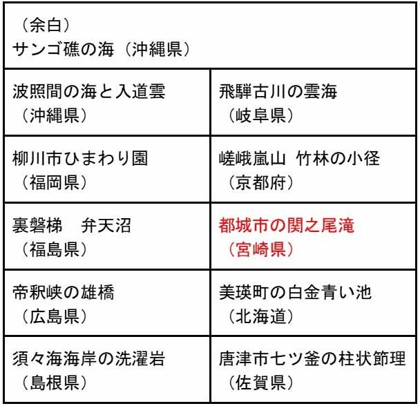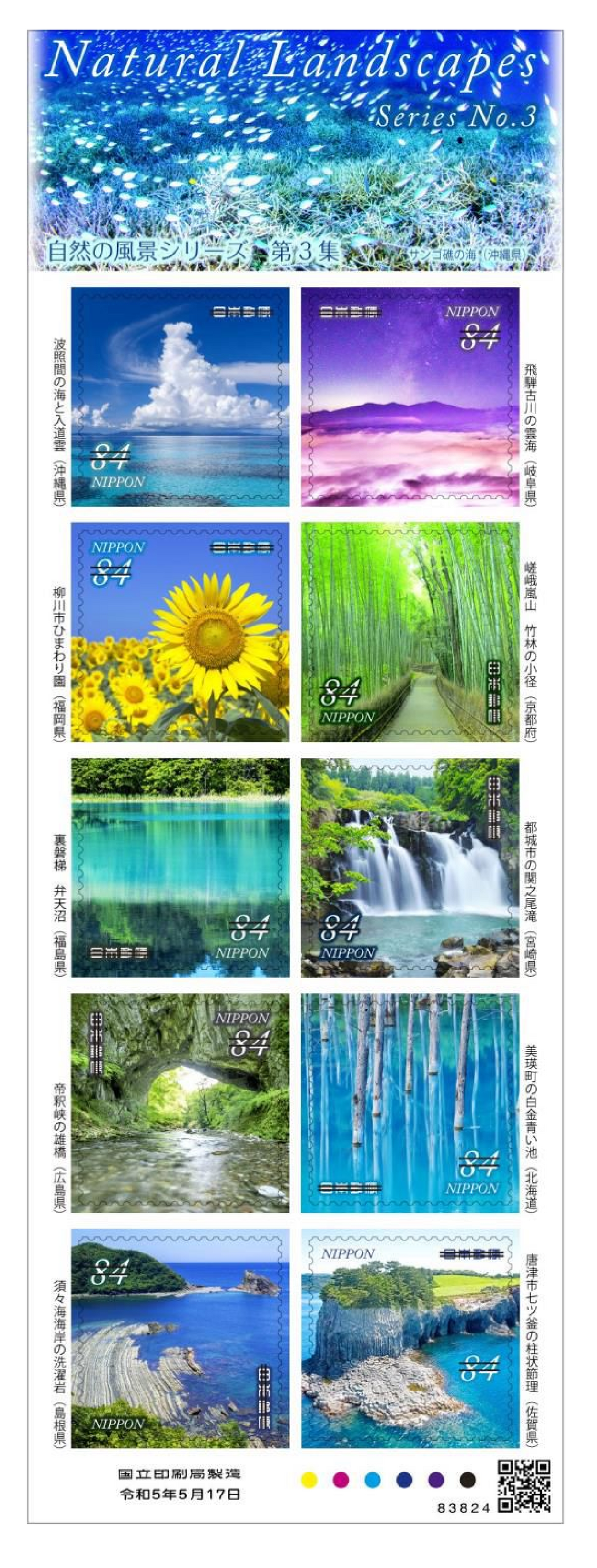 「関之尾滝」が全国各地の絶景名所と並んで特殊切手に採用されました business Twitter Facebook はてブ Pocket LINE コピー 2023.05.26 この記事は約1分で読めます。 日本郵便株式会社より、日本各地の美しい景観や自然現象による絶景を題材にした特殊切手「自然の風景シリーズ第3集」が発行されました。京都府の嵯峨嵐山竹林の小径や北海道美瑛町の白金青い池などと並び、日本各地から厳選された10か所の夏の絶景として「関之尾滝」が採用されています。全国の郵便局などで購入できます。