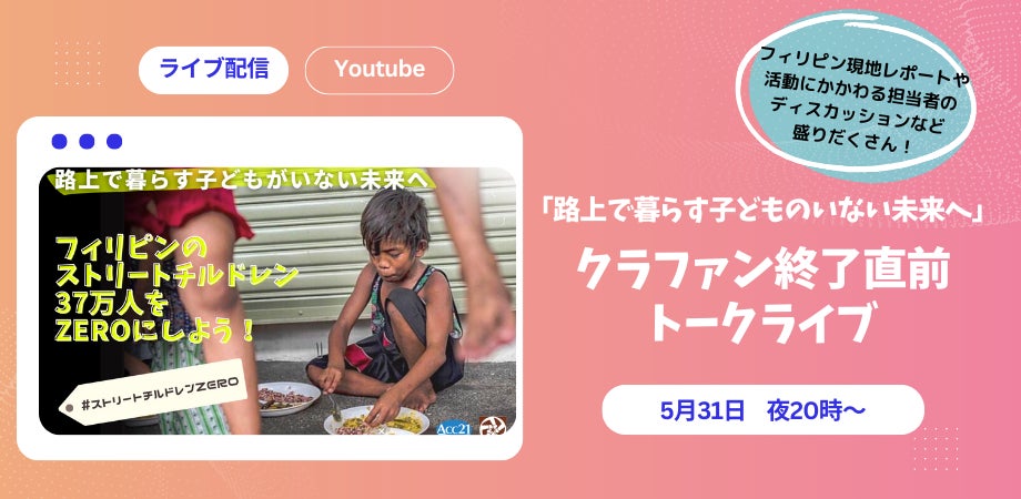 認定NPO法人アジア・コミュニティ・センター21(所在地:東京都文京区、代表理事:伊藤道雄、以下ACC21) は一般社団法人アジア宗教者平和会議東京(以下、ACRP東京)と共同で、5月31日(水)の夜8時からYouTubeにて、「『路上で暮らす子どものいない未来へ」クラファン終了直前トークライブ』を生配信します。
