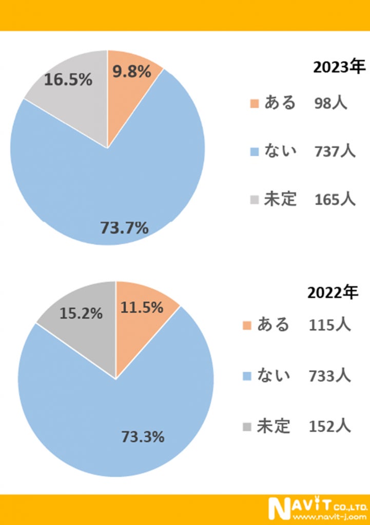「今年の夏、海に行く予定はありますか?」のアンケートに対して「ある」が9.8%で前年(11.5%)よりも1.5%減少しています。前年の調査からの数値の変化は微差と言っていい程度の差になっていますが、アンケートを実施したのが5月だったためか、昨年より1.5%減少する結果となりました。