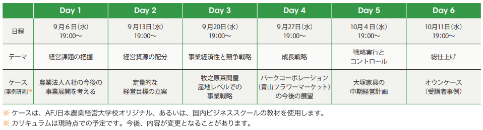 AFJ日本農業経営大学校では、農業経営者を志す人たちに”農業版MBA“を10年にわたり提供し、地域で活躍できる経営者の育成をしてきました。その実績を活かし、これまで培ってきた経営力養成のノウハウを、これからはオンラインで全国へ発信していきます。