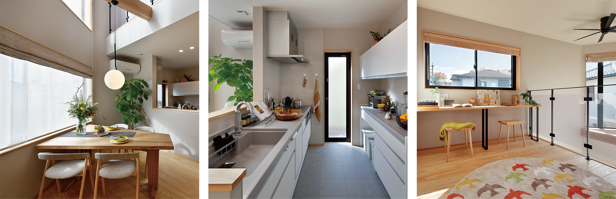 心地の良い吉野杉の無垢板フローリングに加えて、梅雨の時期でも快適に暮らせる、空気中の水分を吸着したり放出したり、空気をきれいにしてくれる珪藻土壁の空間を体感いただけます。