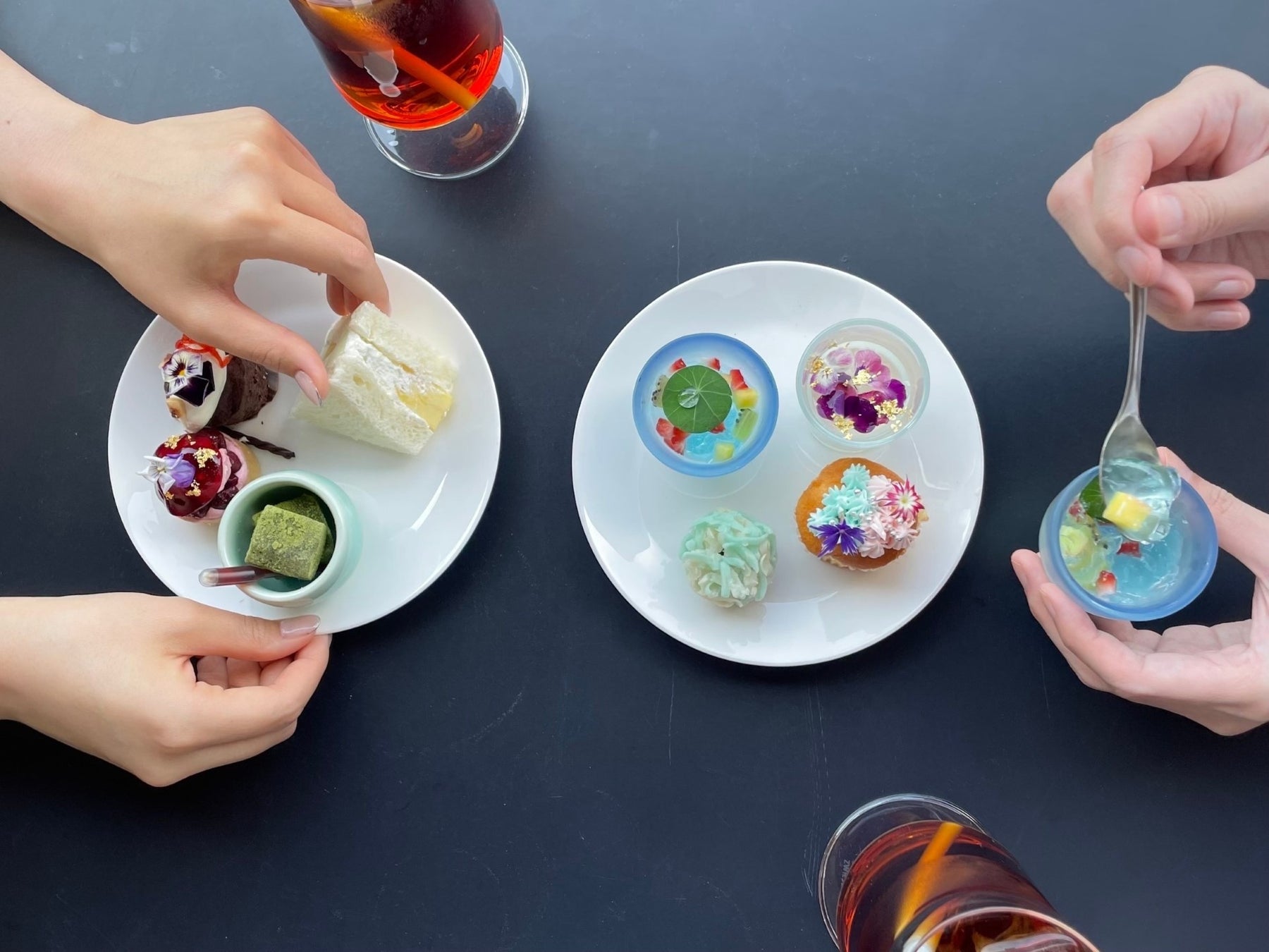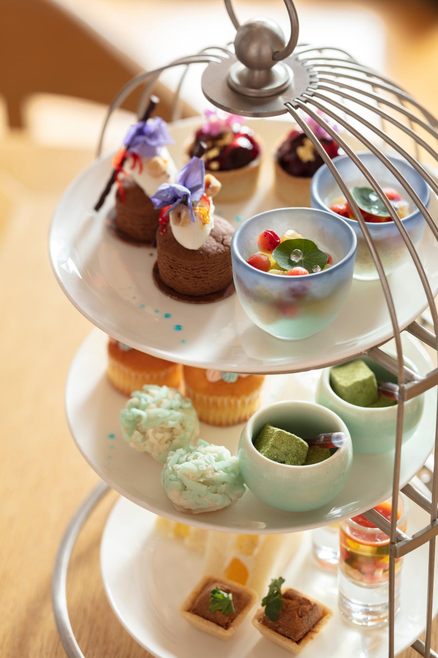 中段: フラワー杏仁 レモンジュレ/紫陽花マフィン/わらび餅 抹茶 黒蜜/和菓子 紫陽花