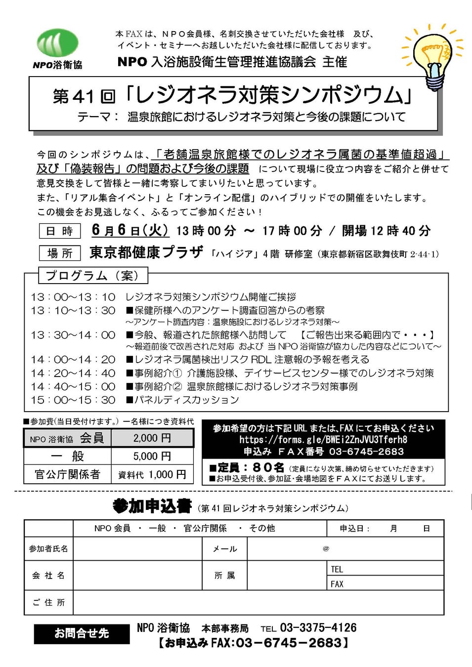 6月6日(火)に入浴施設衛生管理推進協議会主催で「第41回レジオネラ対策シンポジウム」を開催します。