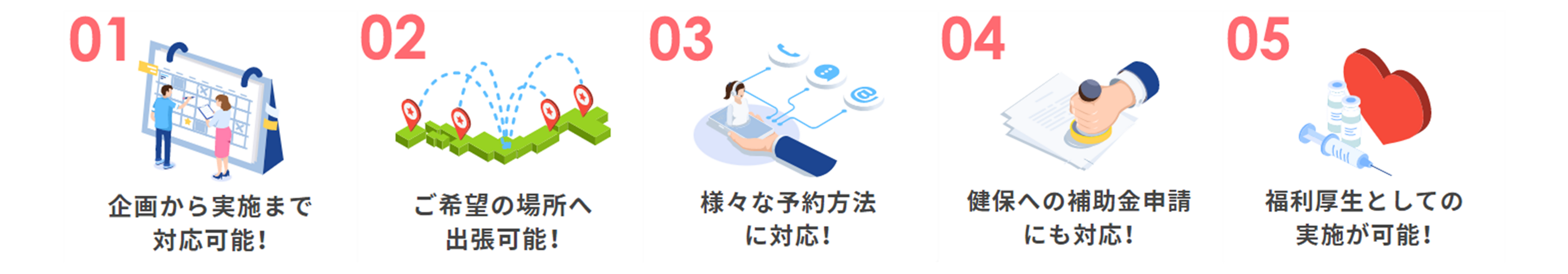 本サービスでは、当社がこれまで提供してきた健診代行サービス(予約受付、医療機関契約、請求精算、補助金申請、結果入力など)を通じて培ったノウハウを活かし、企業および健康保険組合が主体となって実施する季節性インフルエンザワクチン接種の予約受付から医療機関手配、集団接種の当日の運営等を支援してまいります。日本全国の医療機関ネットワークを活かし、首都圏・関西・中部地方を中心に全国対応可能です。