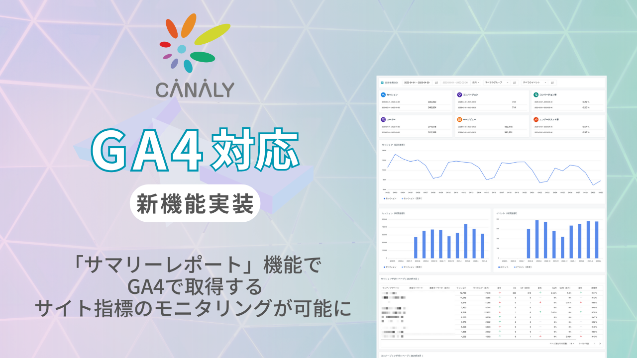 「CANALY」の「サマリーレポート」は、GoogleアナリティクスとGoogleサーチコンソールを連携することで、両ツールを横断してデータを可視化する機能です。これまではUAでのデータ計測のみに対応しておりましたが、このたびGA4での計測に対応した「サマリーレポート」を新機能として実装いたしました。