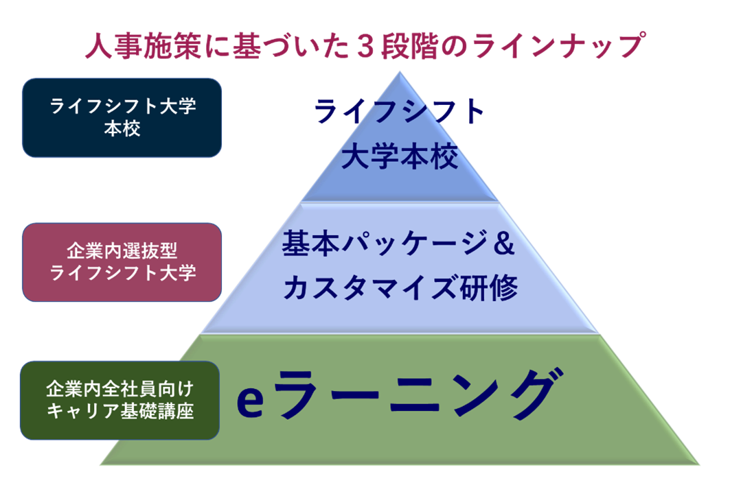 ミドルシニア層活躍に向けた組織・人事コンサルティング・企業研修、社会人向け専門校ライフシフト大学運営サービスを提供しています。
