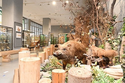 1階には、関西で一番の展示数を誇る鳥類のはく製をはじめ、迫力あるシカやイノシシなどの哺乳類のはく製、昆虫の標本などがフロアいっぱいに展示されています。