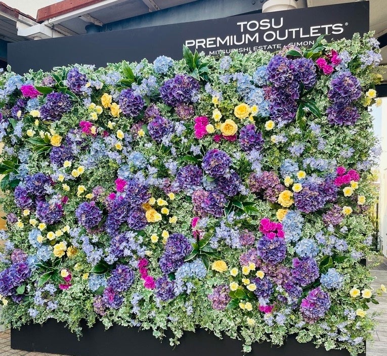 なお鳥栖プレミアム・アウトレットでは、ご来場のお客様に視覚から四季を感じ、思い出に残る日を楽しんでいただきたいという想いから、季節の草花をアレンジした「フラワーウォール」を展示しています。5月~6月は「家族団らん、家族の結びつき」といった意味合いを持つアジサイをメインに、母の日や父の日に選ばれるカーネーションや黄色いバラを使用し、家族への想いをイメージしたフラワーウォールを展示、7月以降も季節に合わせたテーマで展開を予定しています。