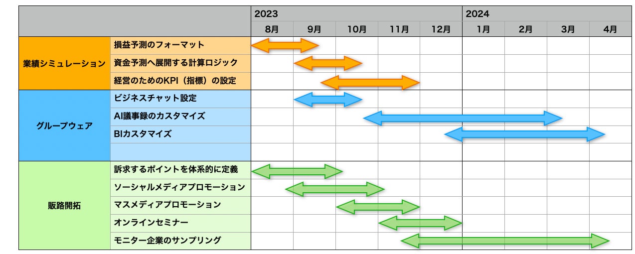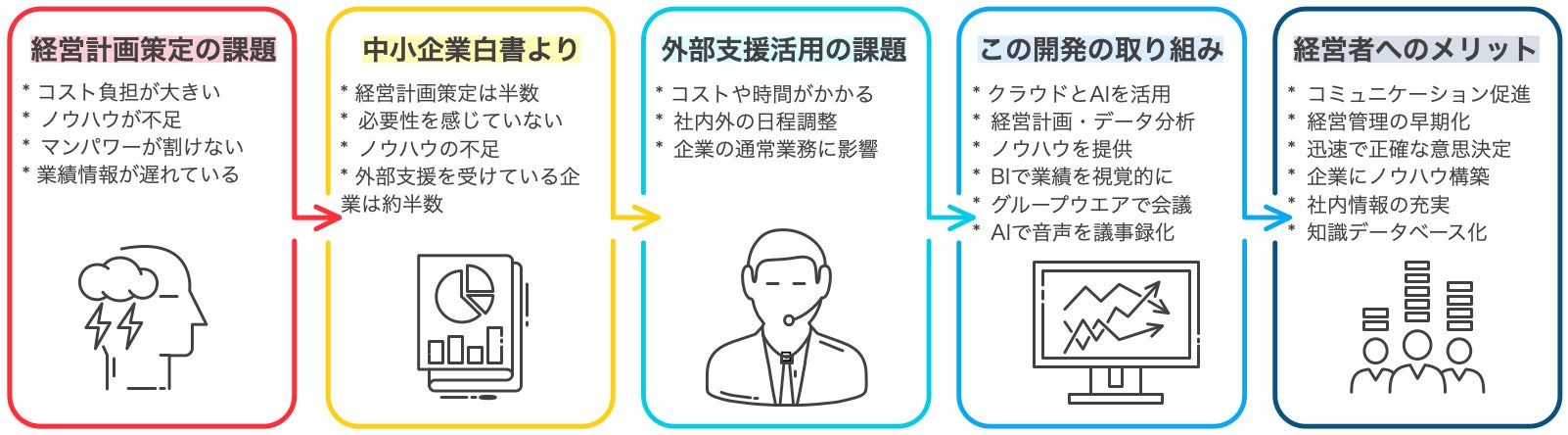 上記のような課題に対して、クラウドとAIを活用して、経営計画やデータ分析のノウハウを提供しています。BI(ビジネスインテリジェンス)で業績を視覚的に表現し、グループウエアで会議などコミュニケーションを効率化し、AIで音声を議事録化することもをスコープにします。これらのサービスメニューは、ビジネスの成長に貢献すると確信しています。 -