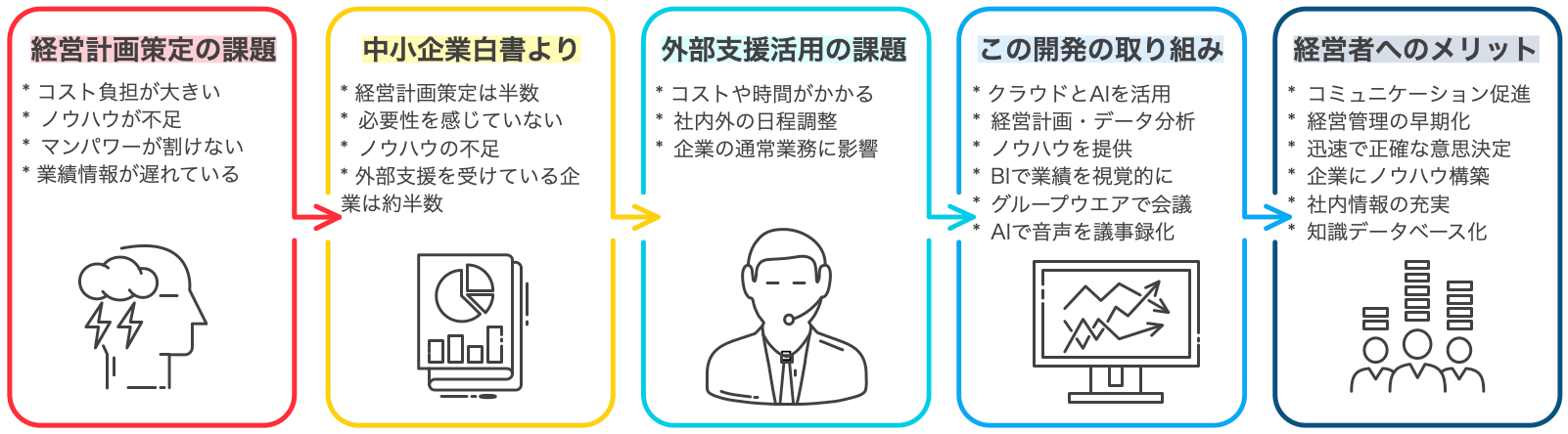 上記のような課題に対して、クラウドとAIを活用して、経営計画やデータ分析のノウハウを提供しています。BI(ビジネスインテリジェンス)で業績を視覚的に表現し、グループウエアで会議などコミュニケーションを効率化し、AIで音声を議事録化することもをスコープにします。これらのサービスメニューは、ビジネスの成長に貢献すると確信しています。 -