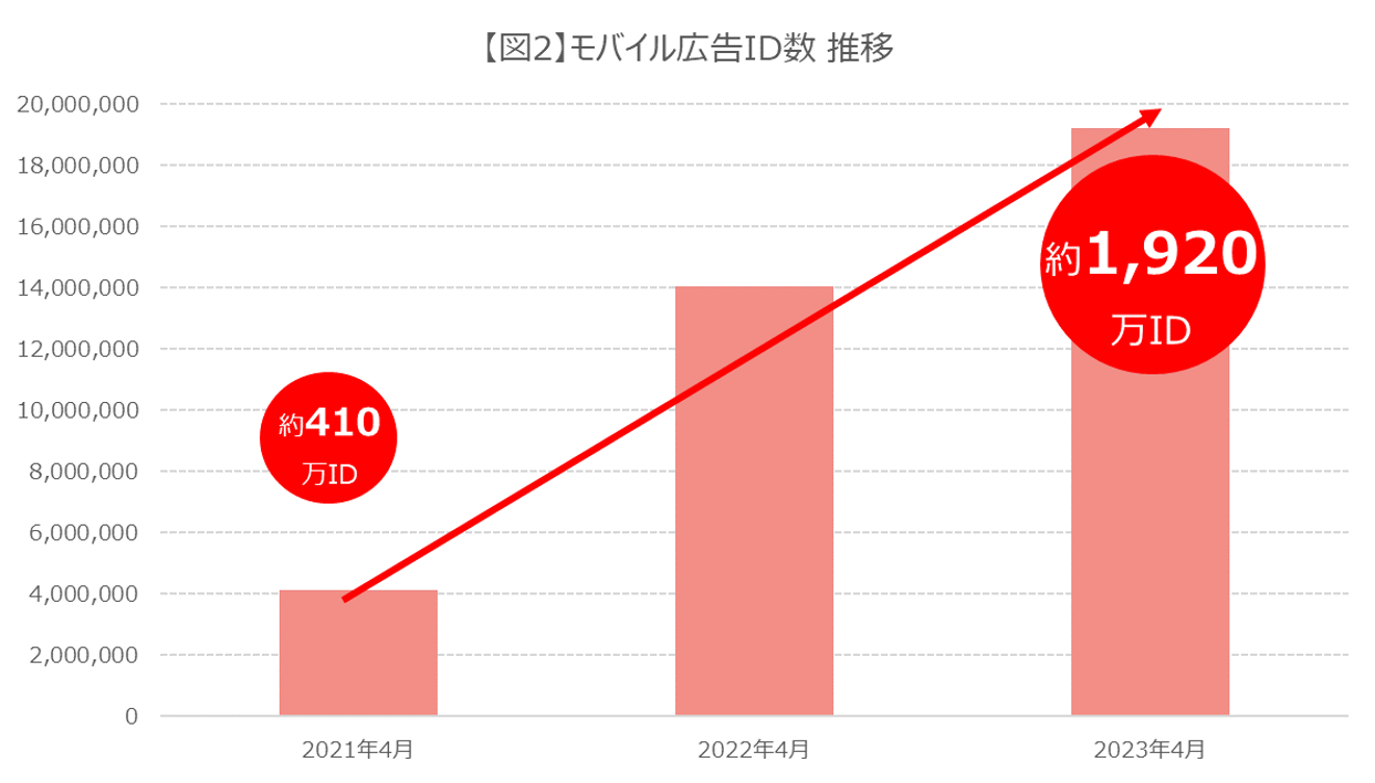 また、「TVBridge DMP」での広告配信に活用できるモバイル広告ID数は1,900万IDを超えました(図2)。モバイル広告ID数の増加により、「TVBridge DMP」(*3)を通じた広告配信でリーチできるユーザー数が増える見込みです。
