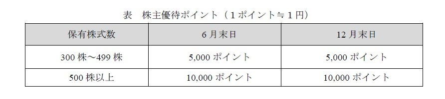 繰越条件:ポイントは6月末日、12月末日において株主名簿に同一株主番号で連続2回以上記載され、かつ300株以上継続保有されている場合にのみ繰越することができ、最大4回分まとめて交換することができます。