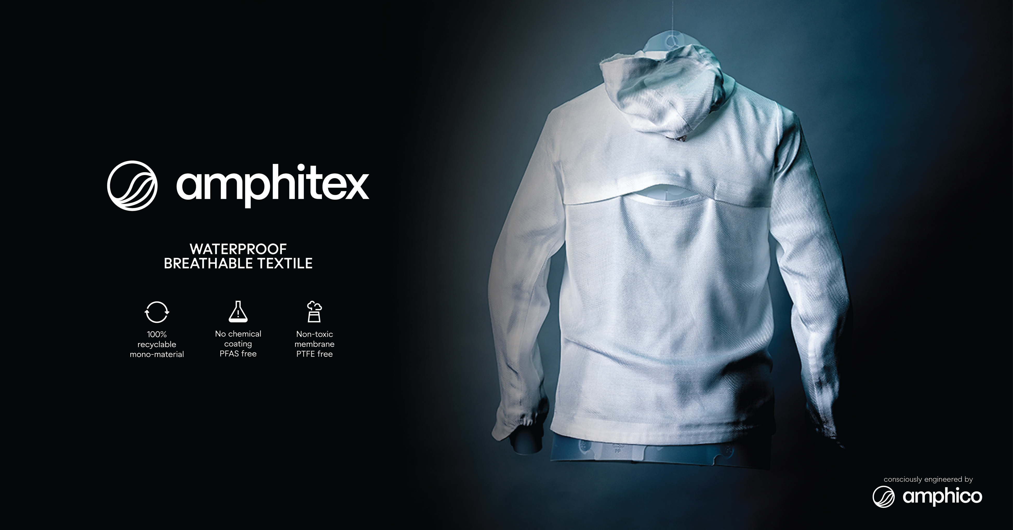 AMPHICOが開発するAMPHITEXは、防水性と透湿性、さらには伸縮性を共存させる100%リサイクル可能な素材です。これまでアウトドアウェアを中心に使用されてきた透湿防水生地は、撥水および防水性能を付与するためにPFAS[2]と呼ばれる有害な化学物質が使用され、深刻な環境汚染を引き起こす課題が指摘されています。