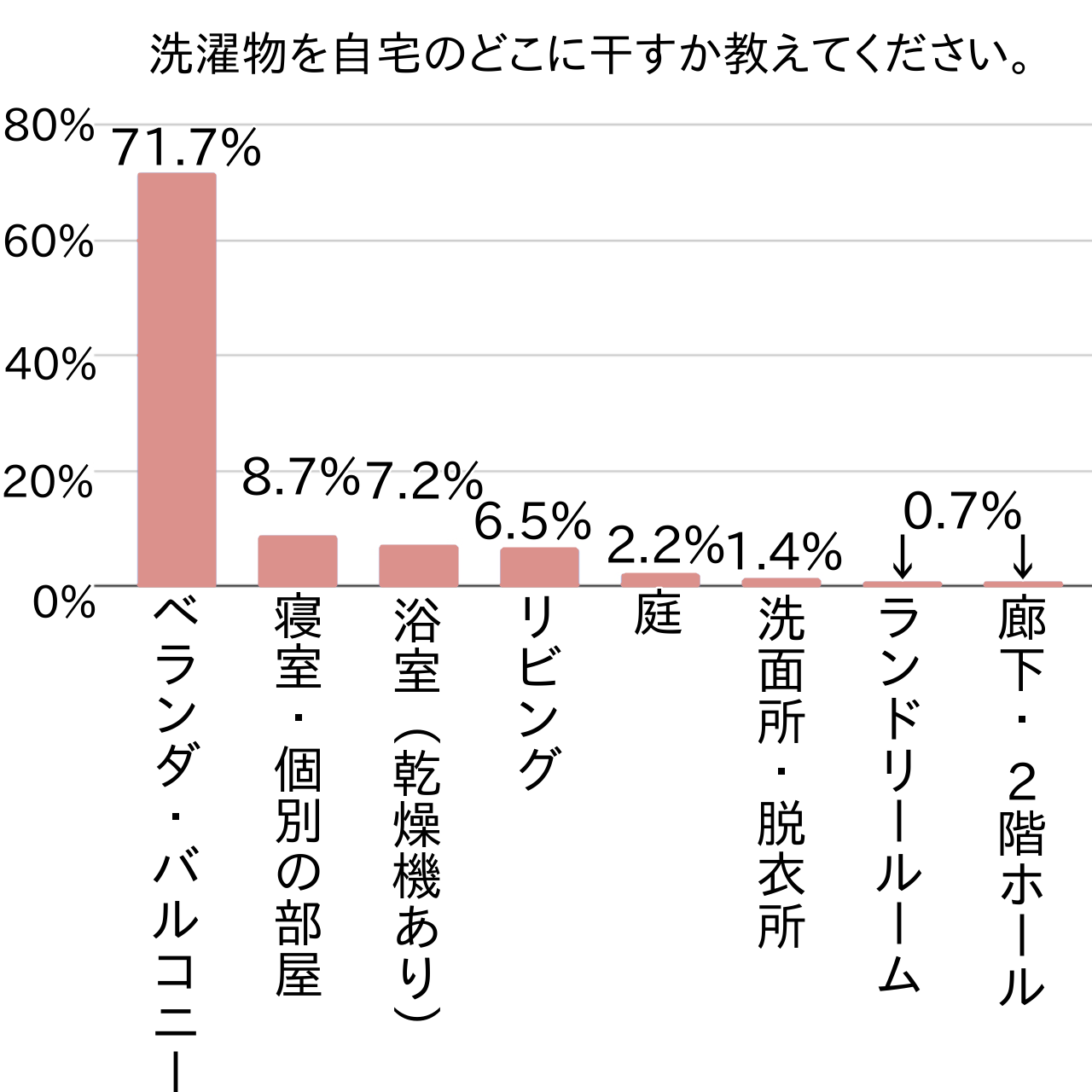 全国での結果も「ベランダ・バルコニー」が61.8%でトップで、「庭(5.5%)」と合わせて全国での外干し率は67.3%でした。なお、都市部が多い関東より全国の方が庭のある割合が多いことも庭に干す割合に影響しているようです。