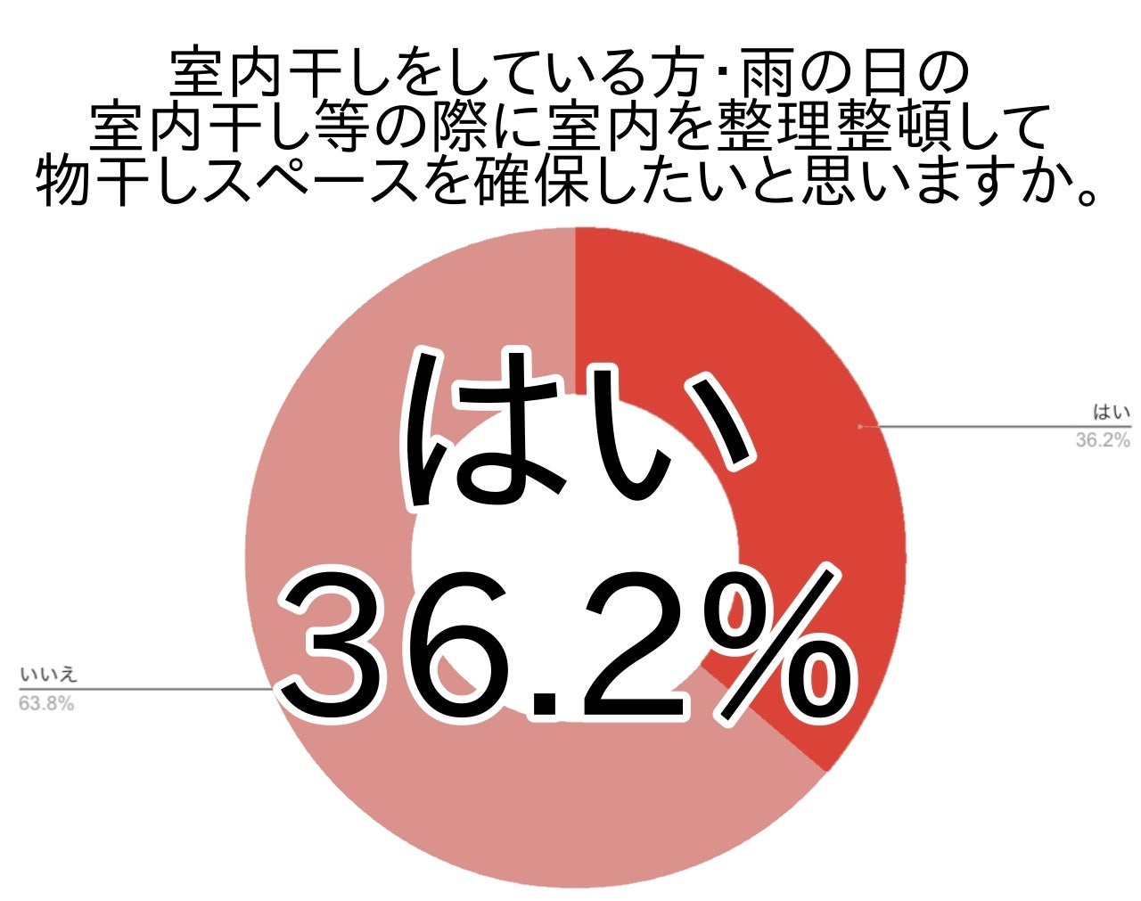 関東にお住まいの方の回答では室内干しのために室内を整理整頓して物干しスペースを確保したいと答えた方が4割弱(関東36.2%・全国38.3%)でした。つまり3人に1人以上の方が室内を整理してスペース確保をしたいと考えています。