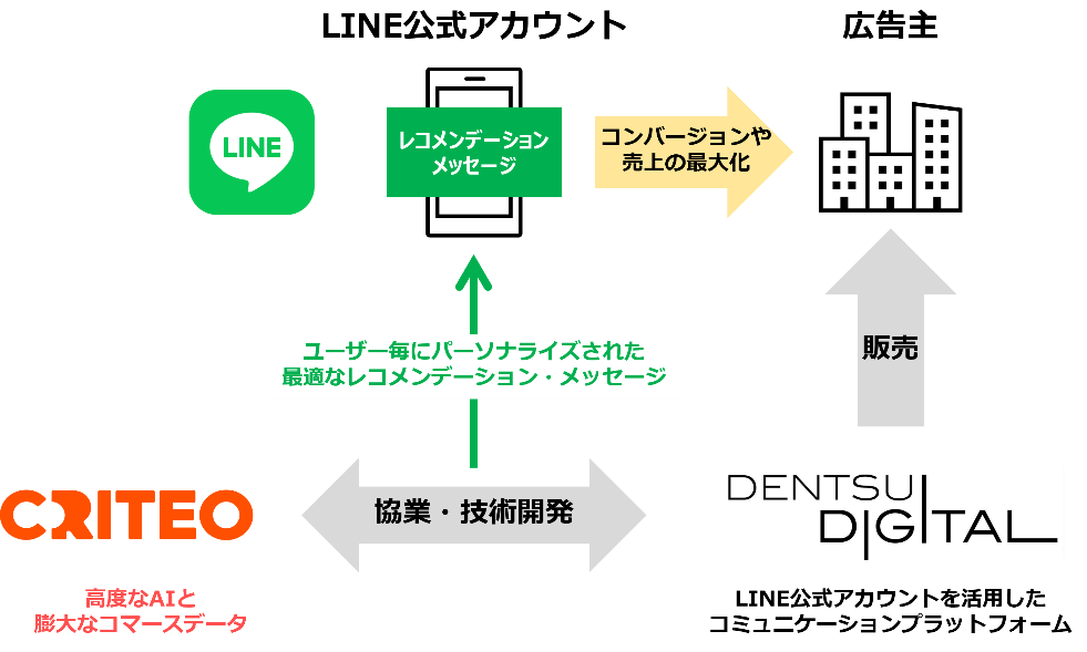 LINE公式アカウントを活用する企業・ブランドにとって、LINE公式アカウントを友だち追加したユーザーの維持(リテンション)は、近年課題に挙げられています。これによりCriteoの膨大な購買データとAI技術を通じてユーザーの興味関心を分析し、最適でパーソナライズされたレコメンデーション・メッセージをユーザーに配信することで、クライアント企業とユーザーとのエンゲージメント強化が可能になります。