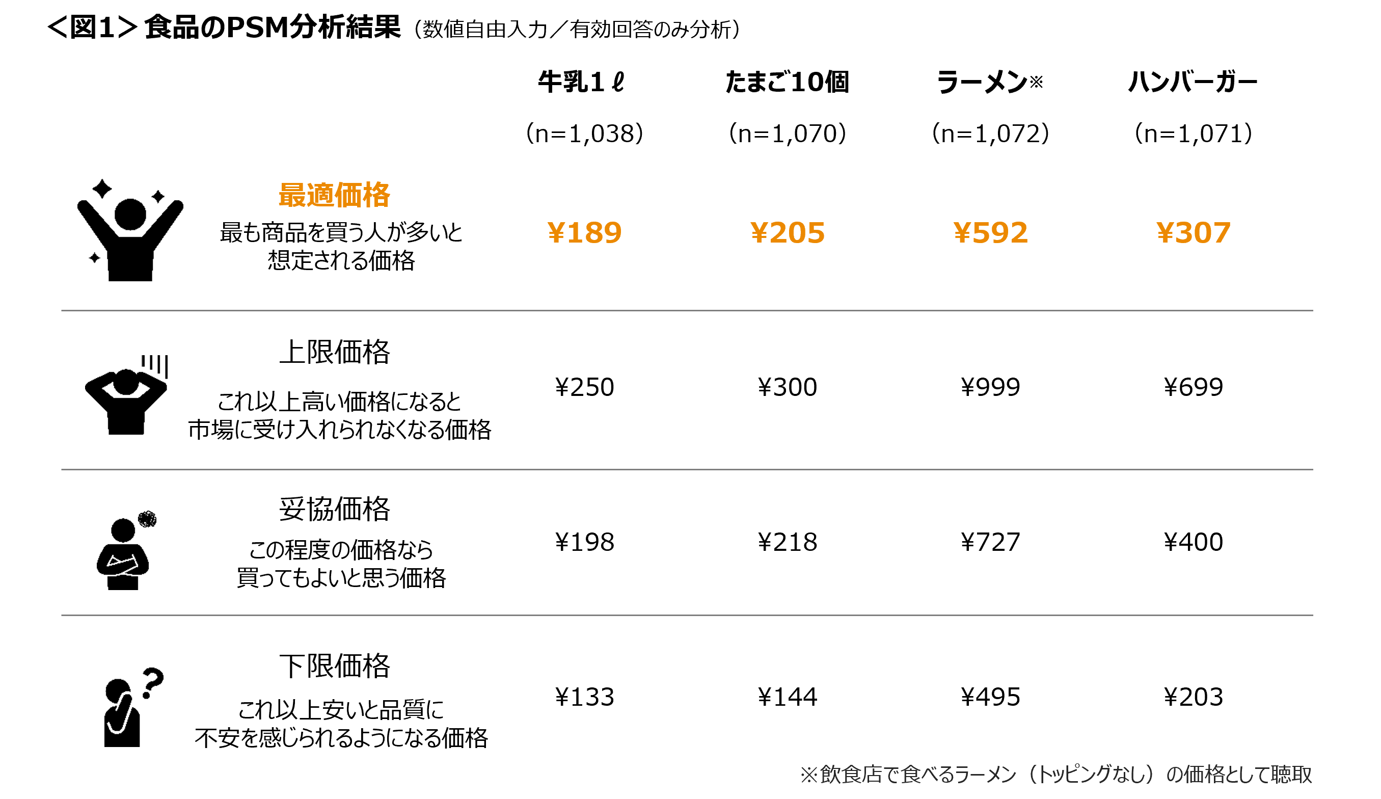 PSM分析の結果、食品の最適価格(最も商品を買う人が多いと想定される価格)は下記の通りとなった。牛乳1ℓ:189円、たまご10個:205円、ラーメン:592円、ハンバーガー:307円<図1>