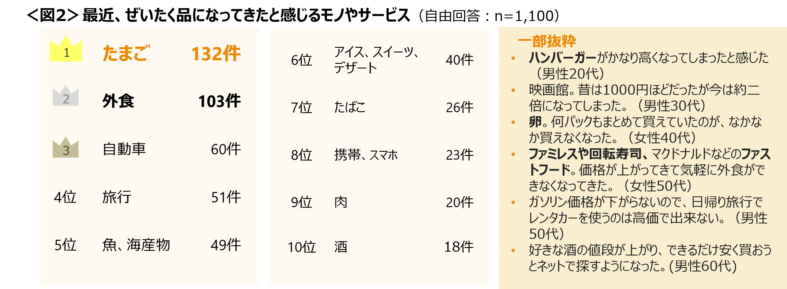 最近、ぜいたく品になってきたと感じるモノやサービスとしては「たまご」が100件以上でTOP。「外食」「自動車」が続く。<図2>