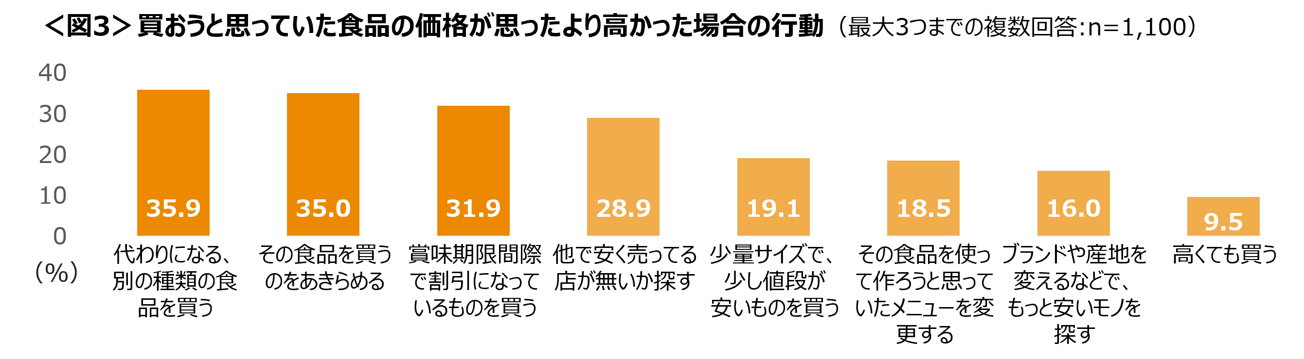 買おうと思っていた食品の価格が思ったより高かった場合、「代わりになる、別の種類の食品を買う」 「その食品を買うのをあきらめる」「賞味期限間際で割引になっているものを買う」が3割台。<図3>