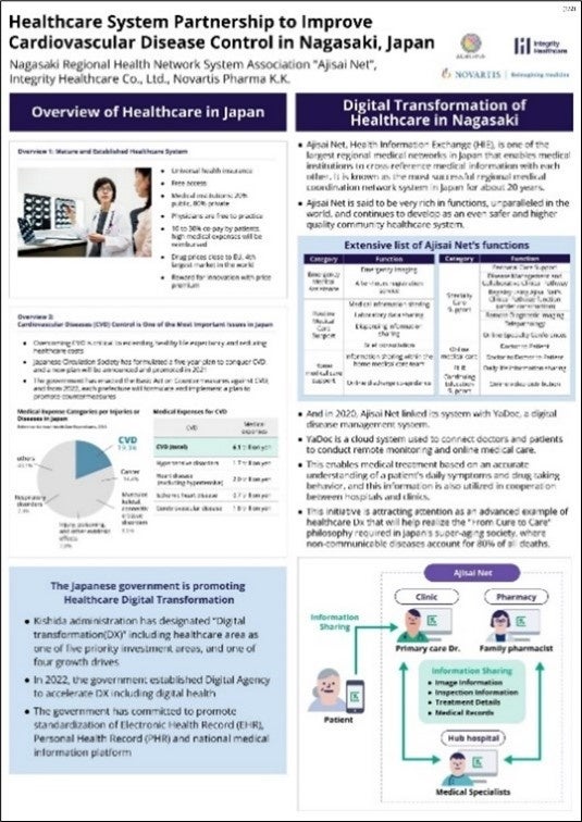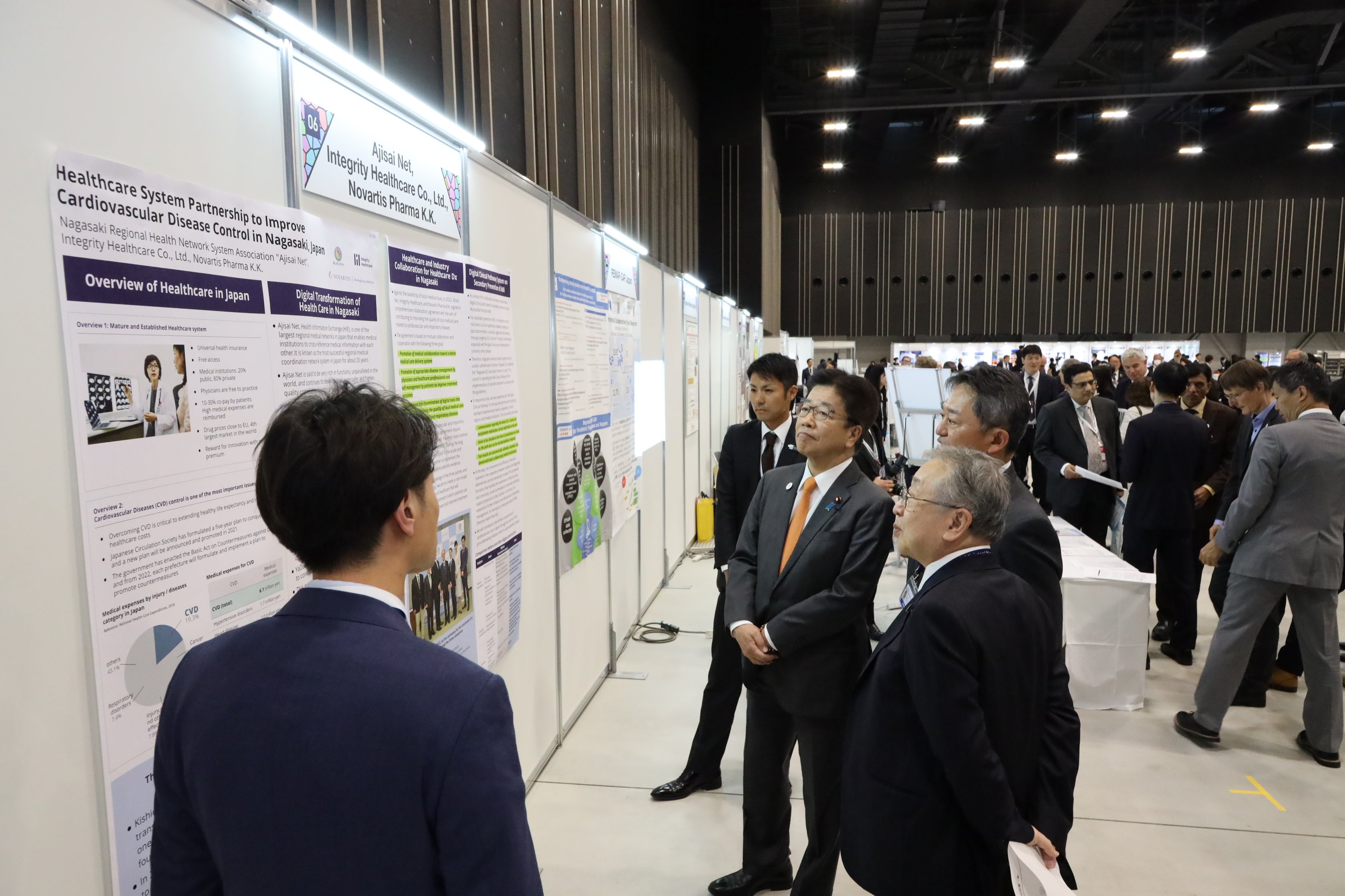 3者は、2022年4月に包括連携協定を締結し、保健医療DX(デジタルトランスフォーメーション)のロールモデルの創出ならびに患者貢献を目指し、急性心筋梗塞(Acute myocardial infarction: AMI)の二次予防への寄与を実現するべく、デジタルクリニカルパス(AMIデジタルクリニカル)を、インテグリティ・ヘルスケアが開発・提供する疾患管理システムYaDocと接続されたあじさいネット上に構築し、病診連携の質、および利便性と効率性の向上に取り組んでいます。ポスターではこれら一連の取り組みを紹介しました。このポスター発表に加藤勝信 厚生労働大臣をはじめ、各国代表と積極的な意見交換がなされました。