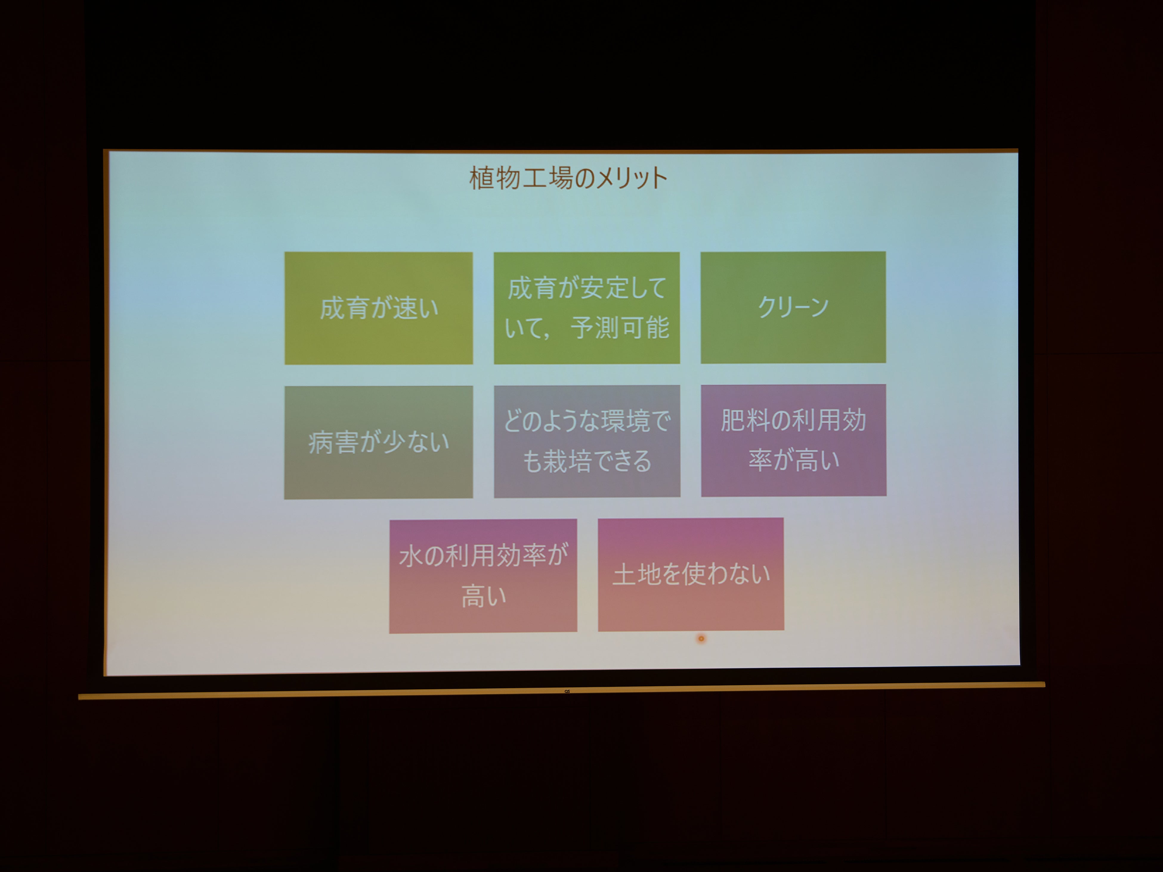 その問題を解決していくための一つの手段が植物工場だと説明。植物工場のメリットについて「植物工場は、成育が速く安定しています。他の植物・生物との競合もなく、栽培しにくい場所でも栽培することができ、予測不能な有害な天候から農作物を守れます。さらに、土地を使わず肥料、水の利用効率が高い点もあります」と語った。