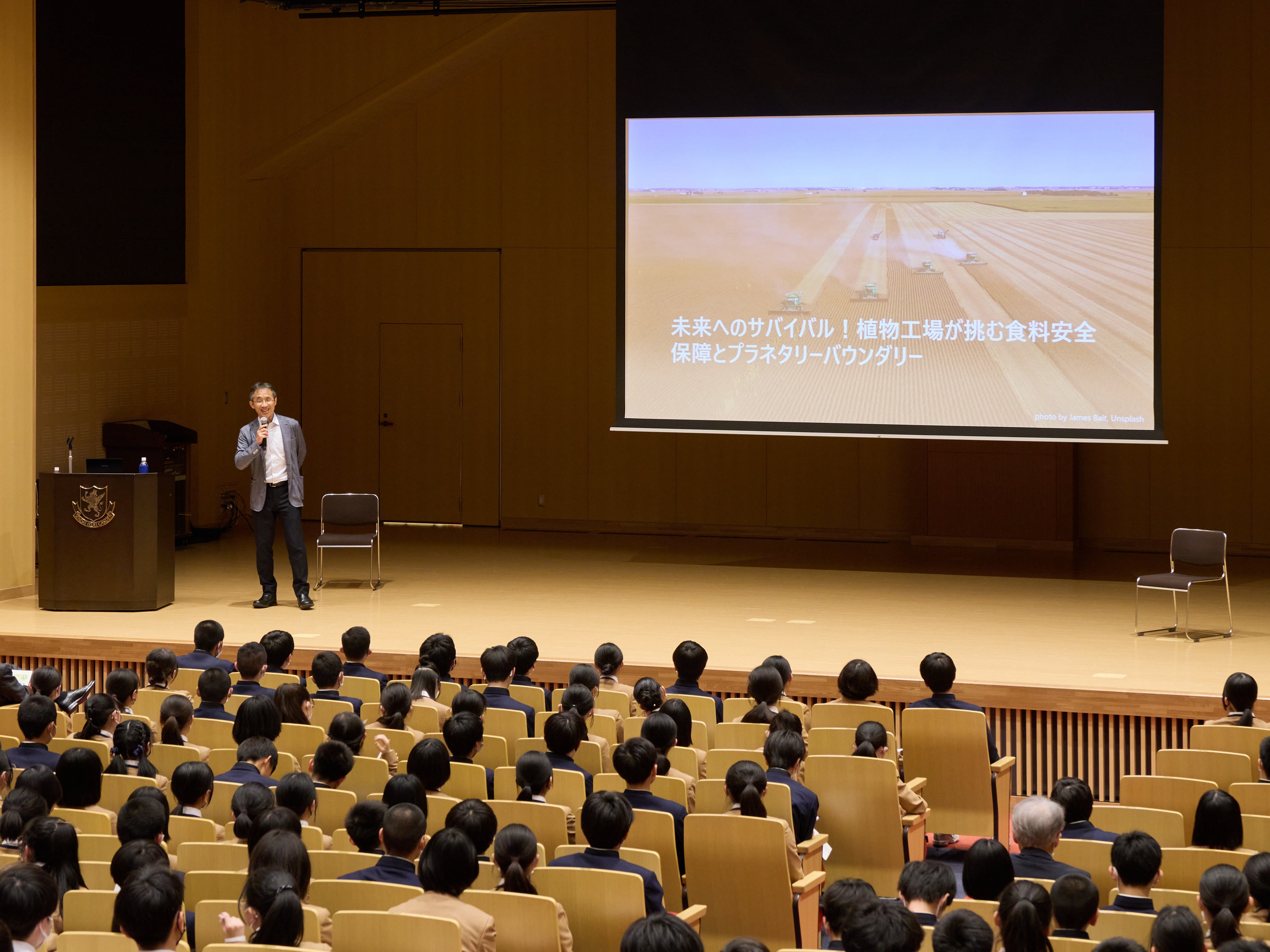 来校いただいたのは、SAAPをご指導いただく、東京大学大学院農学生命科学研究科の河鰭実之教授である。講演名は「未来へのサバイバル!植物工場が挑む食料安全保障とプラネタリーバウンダリー」。会場の宮城野校舎ゼルコバホールには、秀光中学校1〜3年生、仙台育英学園高等学校秀光コース1年生、特別進学コース2年生の理系生徒、そしてせんだいまなびやを選択する生徒の340名以上が集まった。