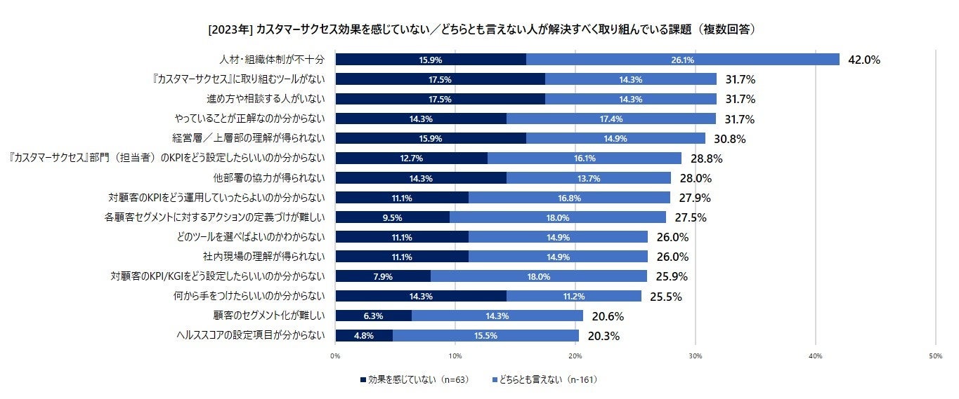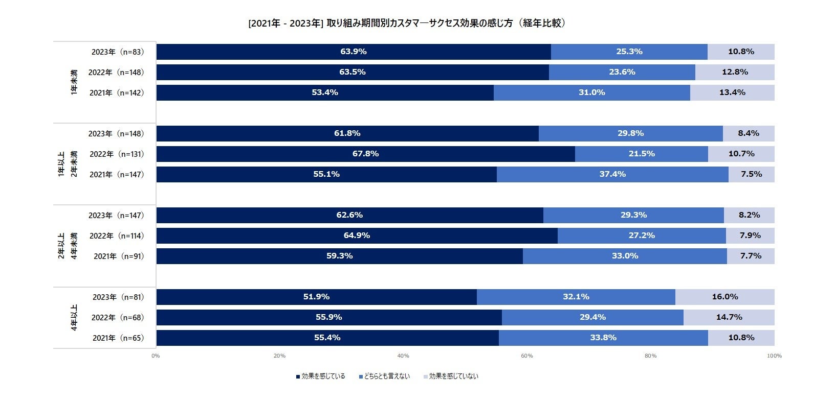 カスタマ―サクセス取り組み期間別で見てみると、取り組み期間1年未満で「効果を感じている」人の割合が昨年より微増しているものの、それ以外のセグメントでは軒並み昨年を下回る結果となりました。「効果を感じていない」わけではないものの、「どちらとも言えない」と感じている人の割合が増えており、取り組みを長く続けていくにつれて何かしらの課題や悩みが出てきている可能性がある結果となりました。