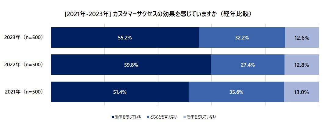 カスタマーサクセス取り組みの効果としては、昨年より減少しているものの、半数以上の55.2%の人が「効果を感じている」と回答。「効果を感じていない」人は昨年とほぼ同様の1割強でした。