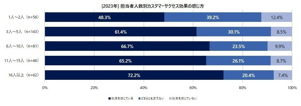 同じく効果の感じ方をカスタマ―サクセス担当者人数別で見てみると、カスタマーサクセス担当者が16人以上いると答えたところで最も割合が高く、72.2%の人が効果を感じていると回答しています。担当者が1~2人と少ないところでは、約半数の人が効果を感じている反面、どちらとも言えないと回答している人が約4割と、人数が少ないがゆえの課題が垣間見える結果となりました。