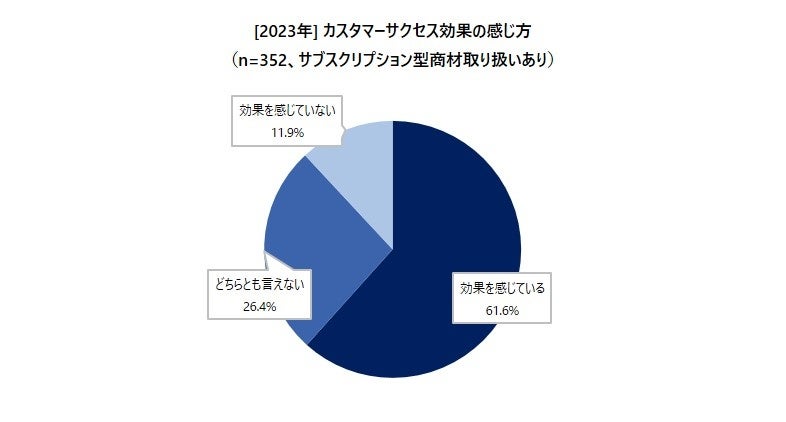 さらに、サブスクリプション型商材取り扱いありなし別でも、それぞれの効果体感度合いを見てみると、サブスクリプション型商材を取り扱っている企業でカスタマーサクセスの効果を感じている人は61.6%、取り扱いがない企業では41.6%という結果になりました。サブスクリプション型ビジネスと相性がいいと言われているカスタマーサクセスですが、サブスクリプション型商材を取り扱っていない企業でも取り組んでいる企業は増えつつあり、その効果も一定出ていることがわかります。しかし同時に「どちらとも言えない」と答えている人が4割以上いるということは、もしかすると取り組みに苦戦している人も多いのかもしれません。ただ「効果を感じていない」と回答している人はいずれも1割強なので、必ずしも取り組みを進めることに否定的ではないということがうかがえます。