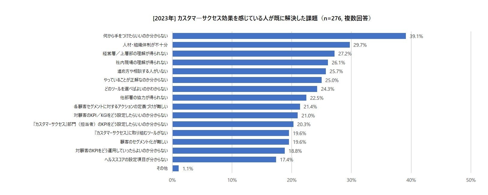 次に、カスタマーサクセスの取り組みを進めるうえでの課題について聞いてみました。「カスタマーサクセスの効果を感じている」人に対して、最初は課題に感じでいたが、現在は解決済みだという課題について聞いてみると、4割近くの人が「何から手を付けたらいいのか分からない」、約3割の人が「人材・組織体制が不十分」とも答えており、多くの人が手探りで取り組み始めたことが推察されます。また、「経営層/上層部の理解が得られない(27.2%)」、「社内現場の理解が得られない(26.1%))」、「進め方や相談する人がいない(25.7%)」という課題が続いており、効果創出のためには社内の理解と組織体制が非常に重要であることがわかります。