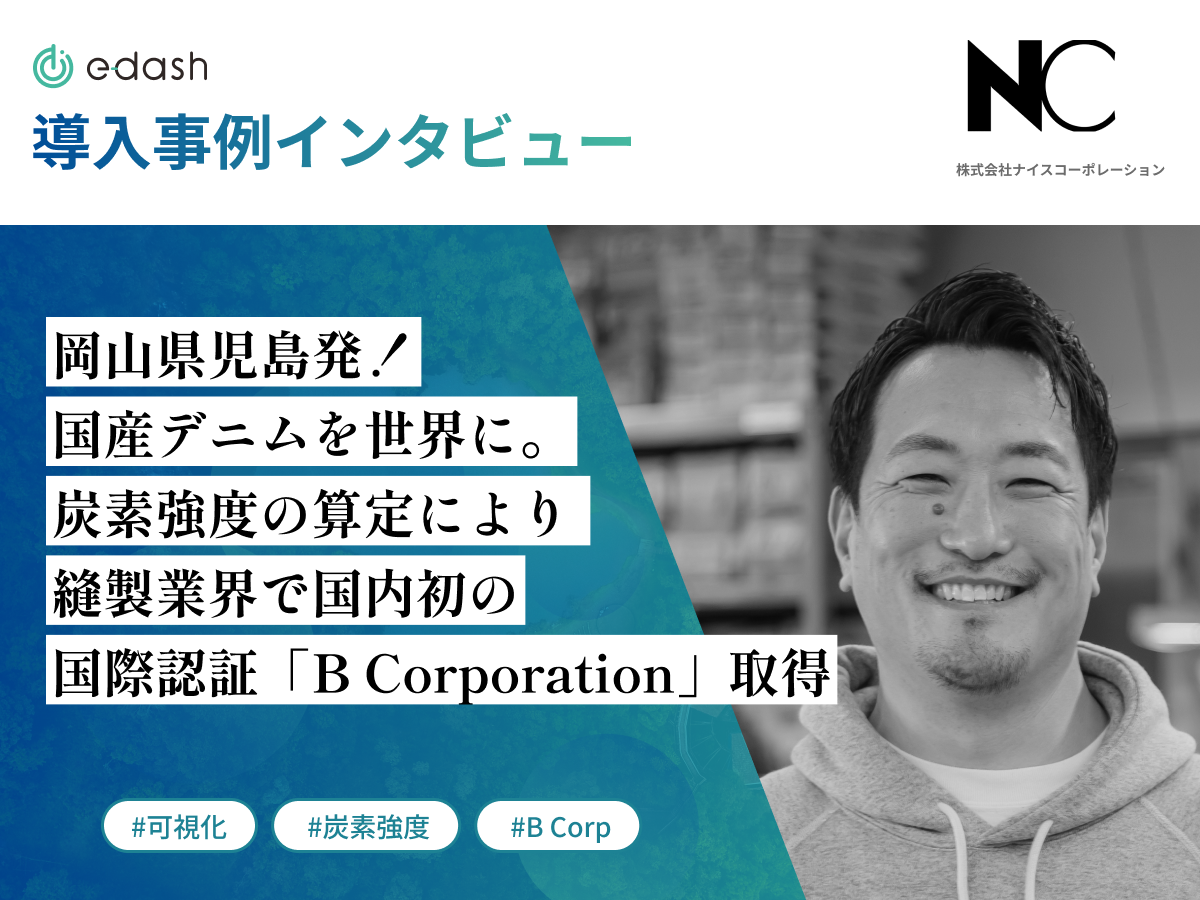 デニムは、製造過程で綿花栽培にたくさんの水を使用するため、世界的にも環境負担が大きいと言われています。加えて化学染料を使うことも踏まえて、アパレル産業における環境負担のイメージを変えていくためには、サステナブルで環境に配慮したものづくりを追求していくことが大切と考えました。そこでナイスコーポレーションではe-dashを導入し、算出が困難な「炭素強度」の計算に活用し、アメリカの国際認証制度である「B Corporation」を取得することができました。(2023年4月取得)