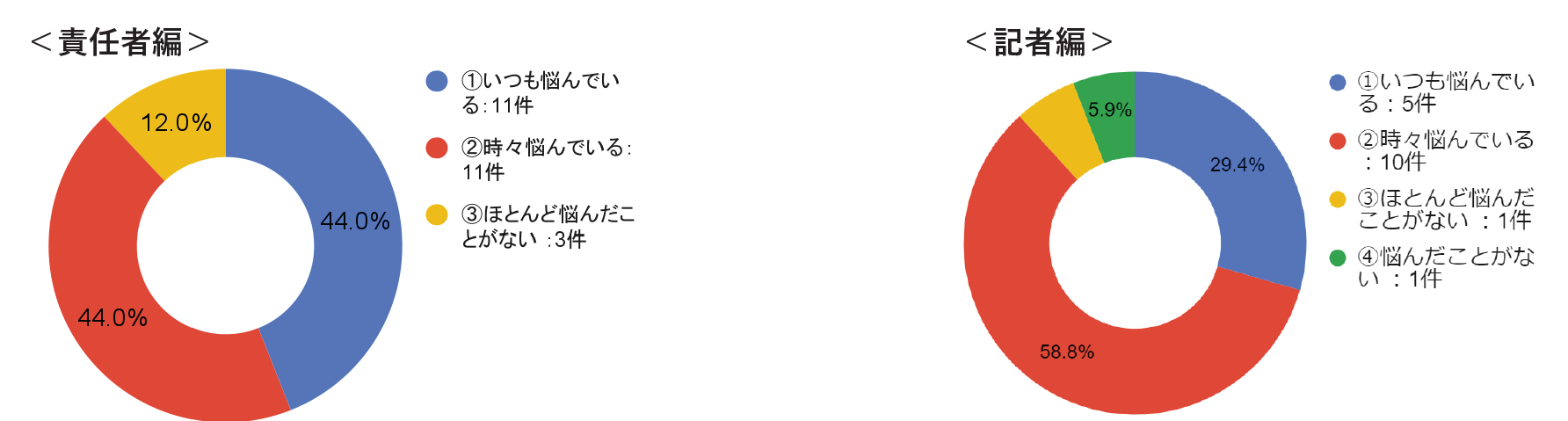 自殺報道にあたって「いつも悩んでいる」「時々悩んでいる」が、責任者・記者とも約90%に上り、メディアが悩みながら報道している現状が浮き彫りになりました。悩む理由について、責任者は「自殺の連鎖への危惧」を、記者は「遺族の心情」を最も多く挙げています。責任者は25社中21社が「記事が目立つようにしない。報道を過度に繰り返さない」などの配慮をしていると回答しました。また、現在の自殺報道に「問題がある」と考える責任者は25社中19社、記者は17人中15人に上りました。