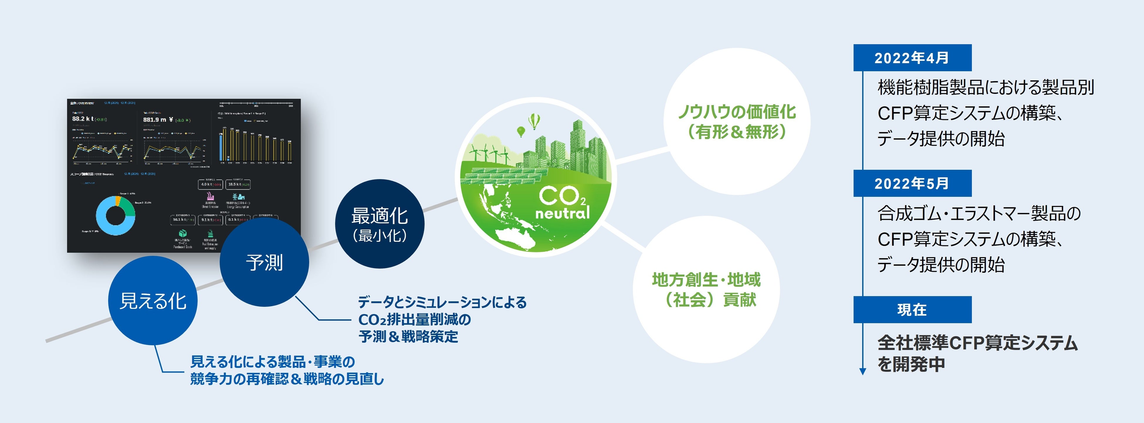2050年のカーボンニュートラル実現に向けて、CO2排出量を可視化するためCFP算定システムを推進しています。まずはマテリアル領域の主要製品を中心に製品ごとのCFP算定を進めており、サプライチェーンの脱炭素化に向けて一部顧客への情報提供を始めました。2023年度には全社標準CFP算定システムを構築し、排出量の可視化により得られた情報を戦略策定に活かしてまいります。