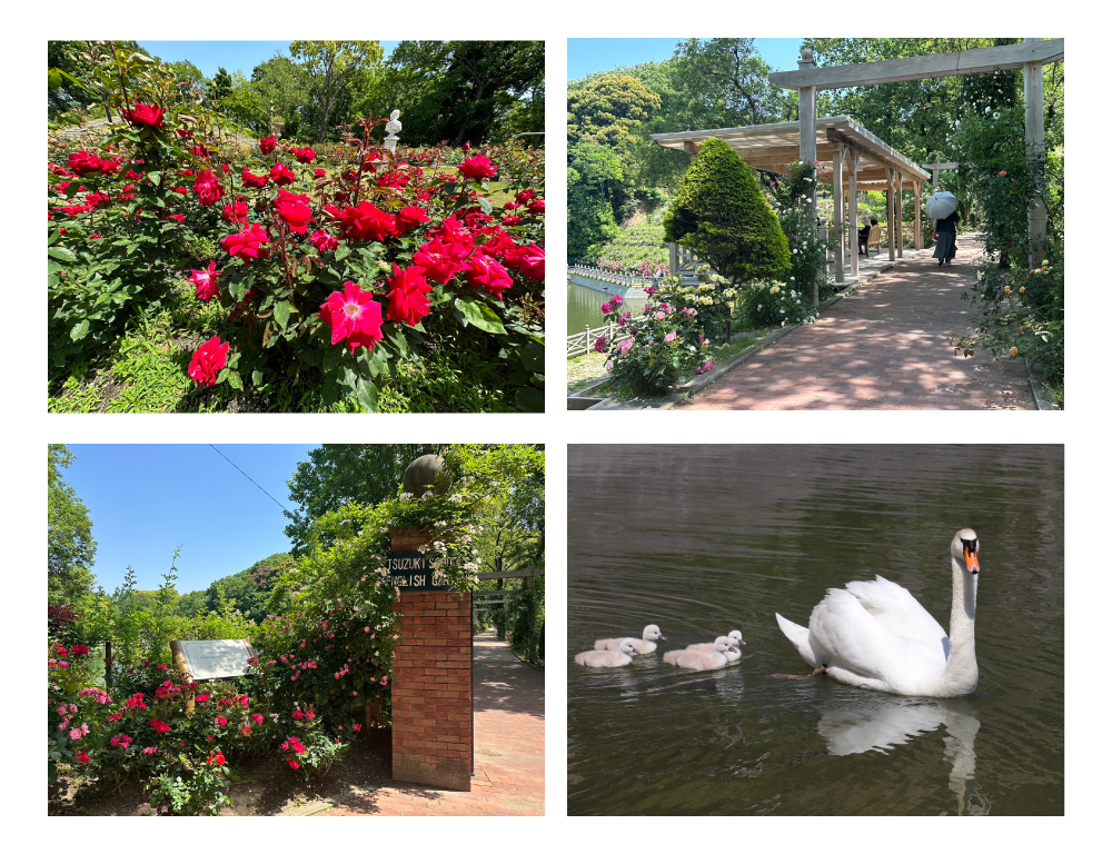 1996(平成8)年開園。1998年には、英国Oxford・Cambridge大学との長年にわたる「日英学術文化交流締結記念庭園」として記念式典を催しました。通年を通して一般公開しており、地元市民や観光客が見学に訪れています。英国からガーデナーを招いて造園した広さ約10万㎡のイングリッシュガーデンは国内最大規模。森の自然な形を生かした造りが特徴で、5月はバラ、6月はアジサイ、7月はスイレン・ハナショウブ、8月はハス、秋の紅葉、秋のバラなど四季折々の草花を楽しめます。ガーデン中央に位置する池(約2万㎡)は、もとは水田用の貯水池で、雨水を活用した資源循環型システムを導入しています。3段構成になっており、上部のアシやキショウブ、中部のハスやスイレンを経て、浄化された水が下部の池に流れ込む仕組み。鯰や錦鯉、亀、海老が生息。コブハクチョウのつがいが飼育されており、年1回自然産卵しています。