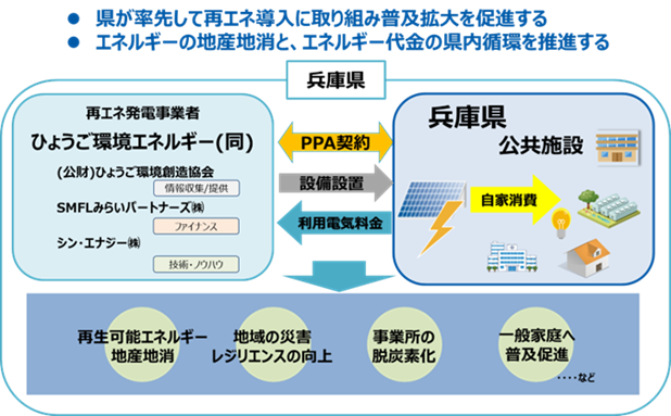 ひょうご環境創造協会が、兵庫県、市町、民間事業者をはじめとする県下に再生可能エネルギーの導入を促進するため、民間企業との共同事業体として新会社の設立を企画。公募の結果、本年1月にSMFLみらいパートナーズ、シン・エナジーの提案が採択されました。