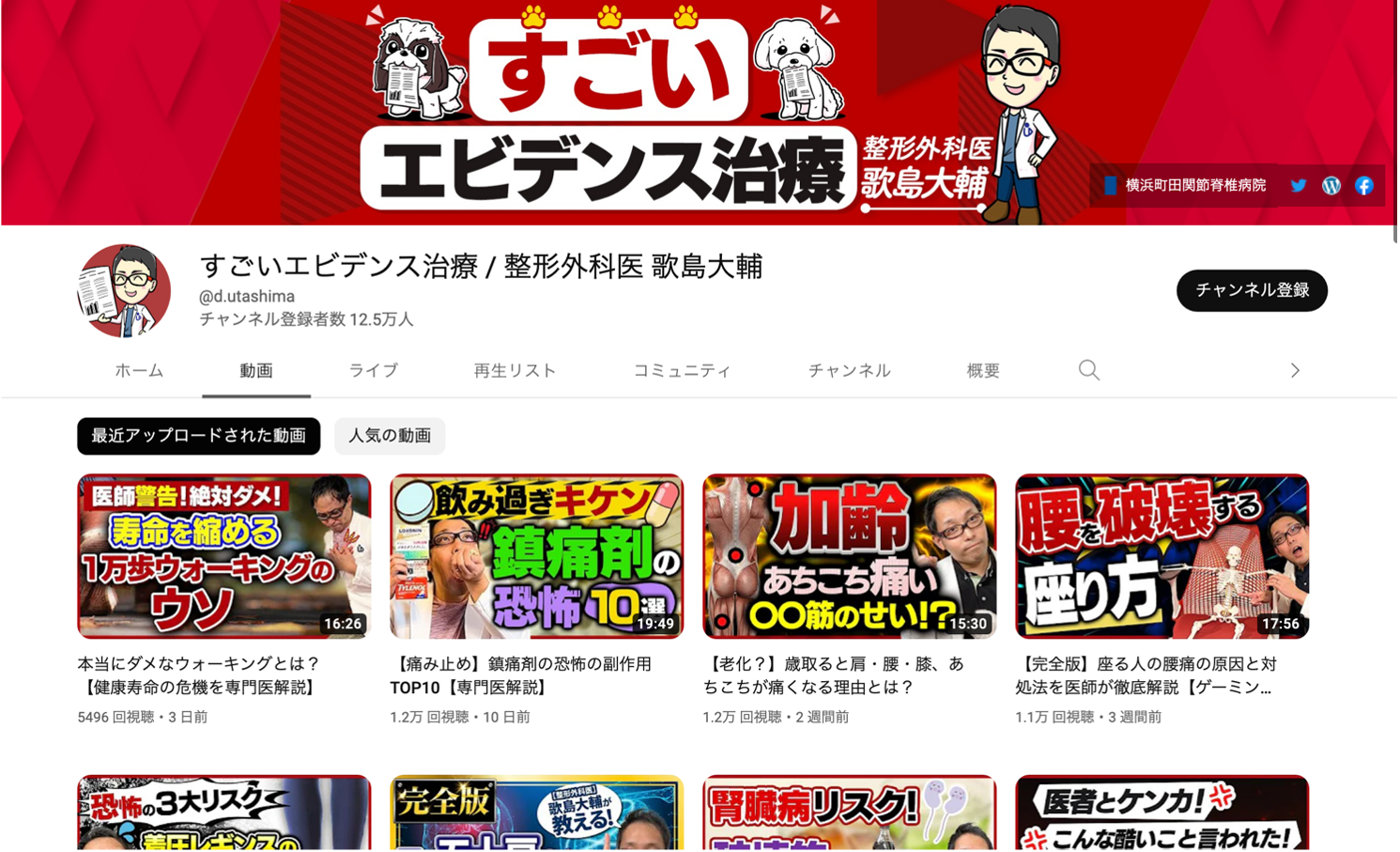 「すごいエビデンス治療 | 整形外科医 歌島大輔」は、健康・医療情報を学び実践するための現役医師によるYouTubeチャンネルで、患者だけでなく治療家にも向けたコンテンツを提供しています。