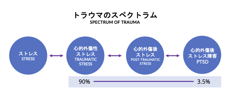 上の図にある、トラウマのスペクトラムによると、心的外傷ストレスと呼ばれるレベルのストレスを受けた体験を含めれば、9割程度の人が日常のストレス以上のものを受けた経験があり、瞑想の実践についてはこの点にも配慮が必要と考えらています。