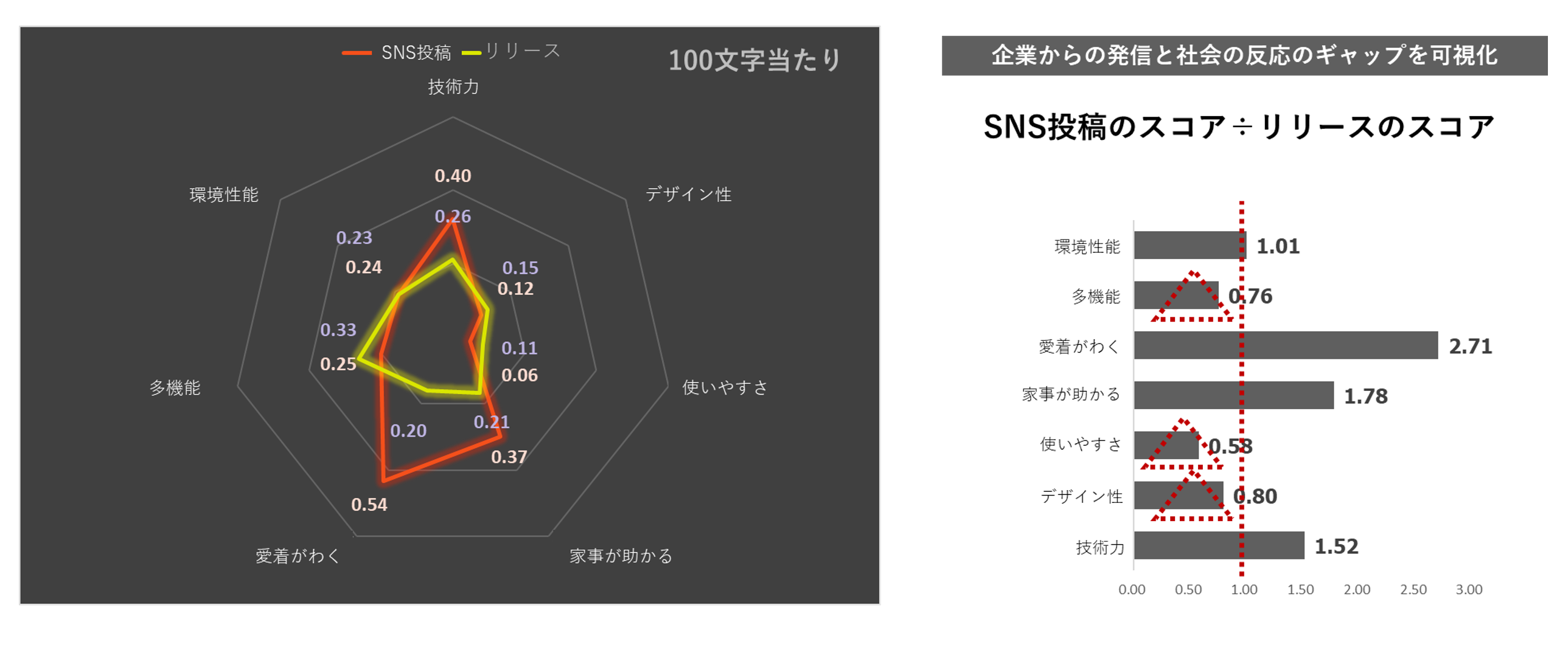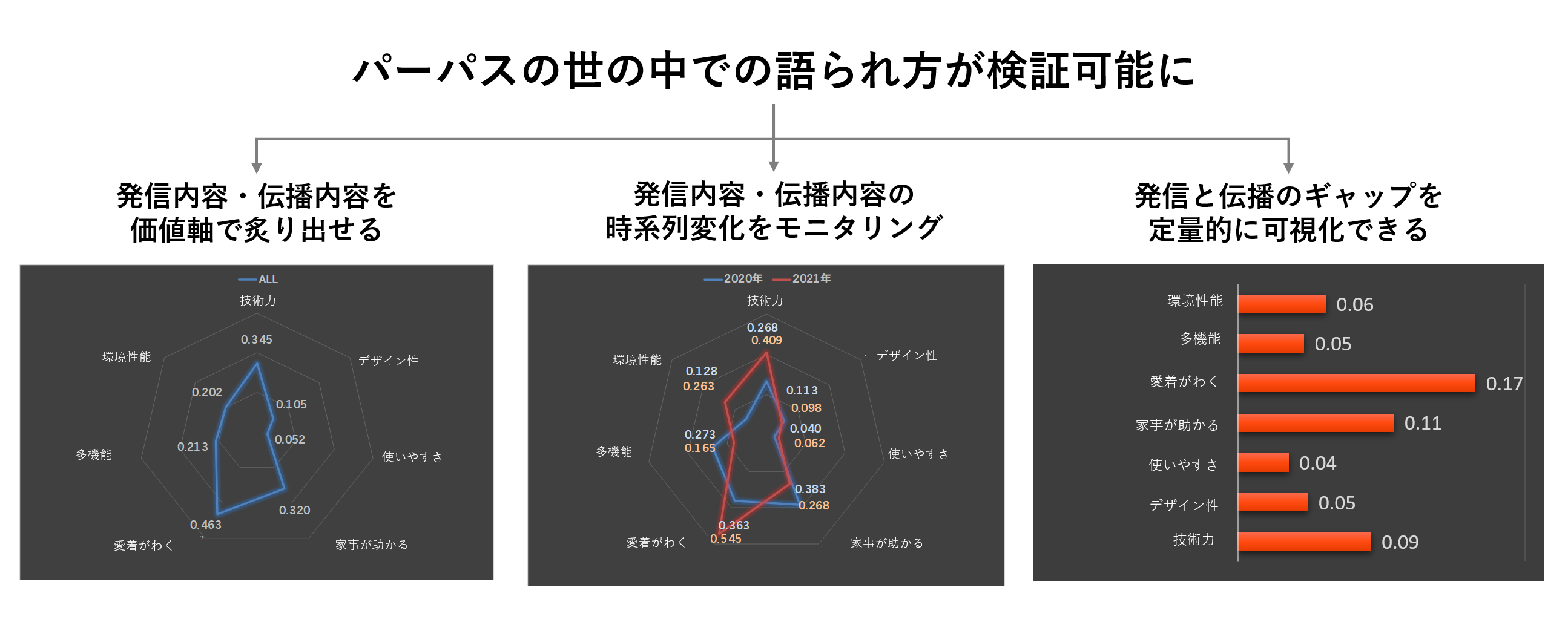 架空の家電メーカーブランドのパーパスを構成する価値を7つの軸 (技術力、デザイン性、使いやすさ、家事が助かる、愛着がわく、多機能、環境性能) に整理し、各軸について「社外の生活者によるSNSでの発話」と「自社からのニュースリリースでの言及」をスコア化。「企業からの発信と社会の反応のギャップ」を可視化したり、「自社からも実はしっかりと発信できていない価値」を把握したり、定点でスコアをとり「アクションによってどのように変化があったか」を測定したりといった分析・行動が可能に。