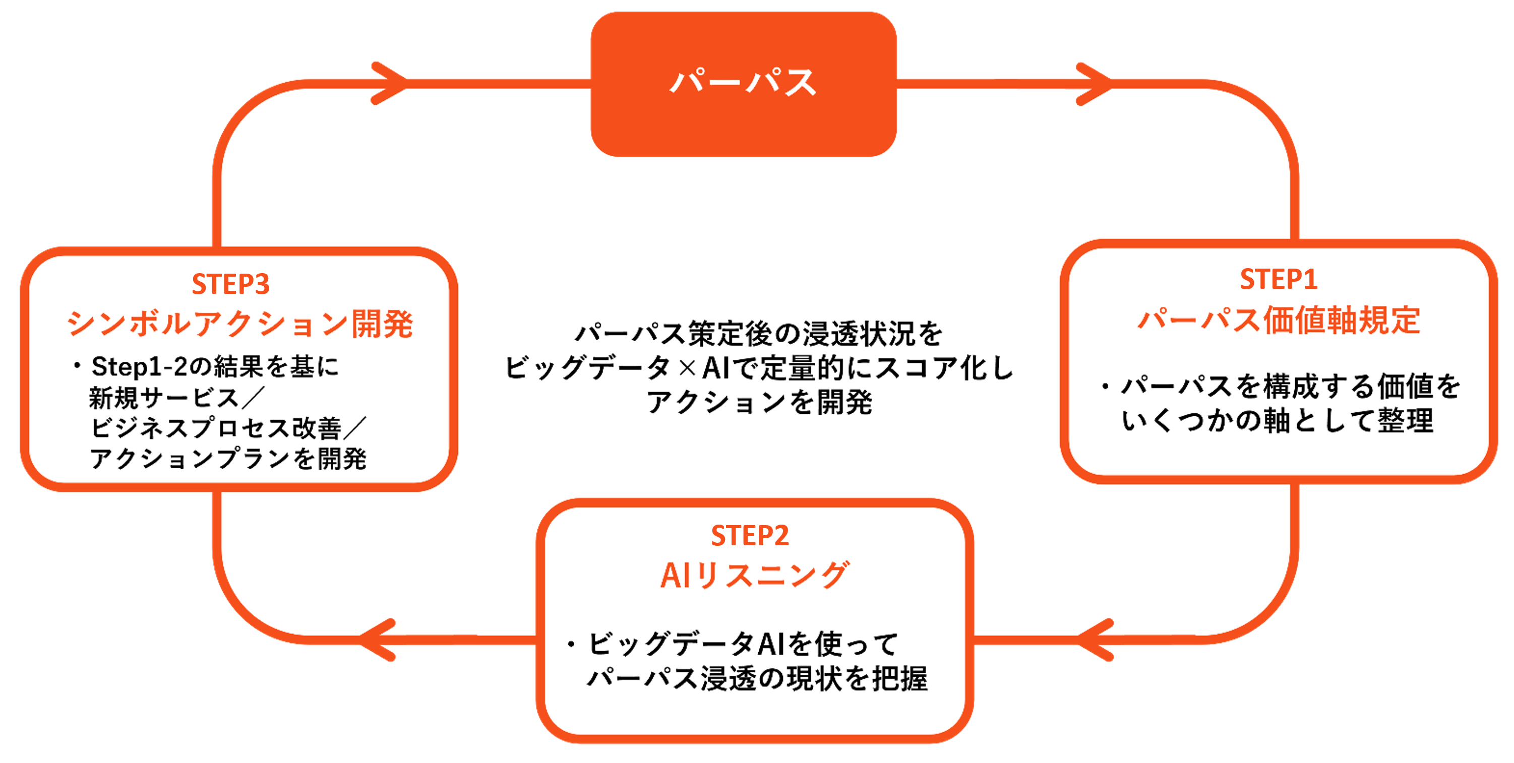 「パーパス・アクション・サイクル」の3つのSTEPを循環することで、企業と顧客・社会との双方向・持続的なコミュニケーションが可能になり、真の意味での「パーパスの実践」を推進します。パーパスドリブンな組織風土への変革、生活者や世の中とのパーパス共有などのビジネス活動の効果を測定しながら、企業/ブランドの発展を支援いたします。