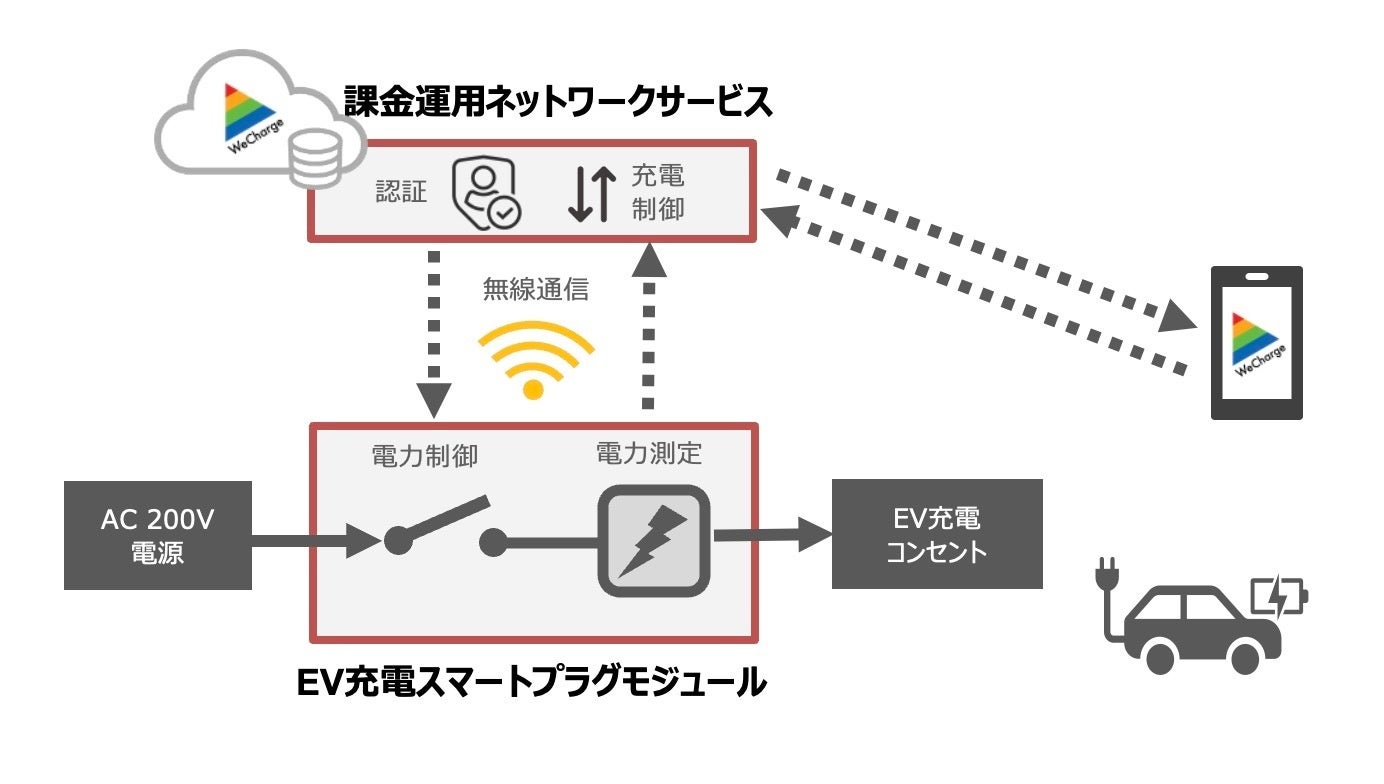 近年、カーボンニュートラルの実現に向け、EV車の利用が加速しており、それに伴い住宅や会社、商業施設に適したEV車の充電サービス・インフラの普及拡充が求められています。ユビ電は場所にも地球にも気がねなく、いつでもどこでも「じぶんの電気」を自由に使える電力環境を目指して、電気自動車(BEV)・プラグインハイブリッド車(PHEV)に対応した充電サービス「WeCharge」を2021年から提供しています。オムロンとユビ電は、個別設置向けのEV充電インフラ拡充を目指し、EV充電コンセント毎に導入できる給電サービス開発をしております。今回オムロンは、個々の充電器に後付け設置が簡単でかつ、電気使用量を測定できるモジュールを開発します。本モジュールをEV充電コンセント内に設置し、「WeCharge」と連携することで、利用ユーザー毎の充電料金を算出するサービスを充電器1基から実現します。