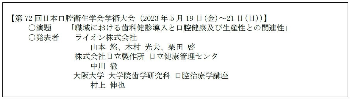 ライオン株式会社(代表取締役社長 竹森 征之)は、株式会社日立製作所の日立健康管理センタ(※1)(茨城県日立市)と協働で、企業における歯科健診の導入が従業員の口腔・全身健康に及ぼす影響について、調査研究を実施してきました。これまでに、歯科健診が従業員の口腔健康状態の改善につながるとともに、全身健康にも寄与する可能性を確認し、当社リリースにて報告しています(2023年2月)(※2)。本研究では、人間ドックと歯科健診をともに受診した日立グループ従業員を対象に、問診データからオーラルケア行動と生産性との関連について解析しました。その結果、対象者のうちオーラルケア行動が増加した従業員(※3)は、生産性を評価する指標の一つであるプレゼンティーズム(※4)が有意に改善していることが分かり、歯科健診をキッカケとしたオーラルケア行動変容が従業員の生産性の向上に寄与する可能性が明らかとなりました。本研究の内容は、2023年5月19日(金)~21日(日)に開催された「第72回日本口腔衛生学会学術大会」にて当社と日立健康管理センタが共同で発表しました。