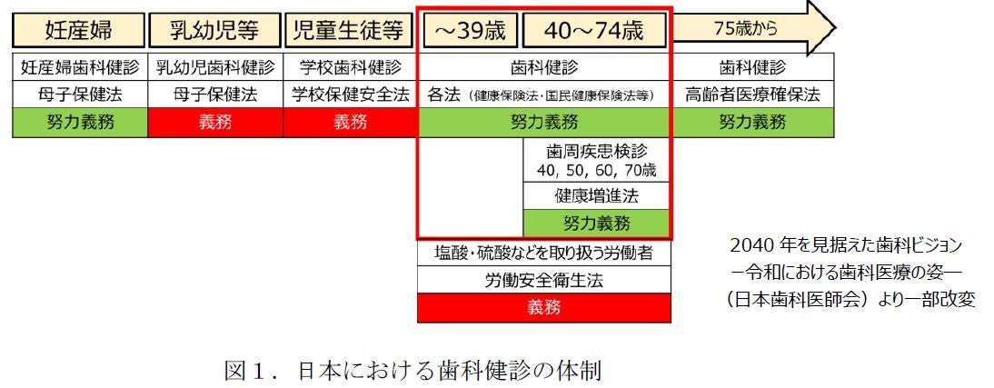 近年、政府が掲げる「経済財政運営と改革の基本方針2022(骨太方針2022)」のなかで、生涯を通じた歯科健診(いわゆる国民皆歯科健診)の具体的な検討が盛り込まれるなど、歯科口腔保健の推進に向けて、歯科健診に注目が集まっています。しかしながら、現在のところ、成人以降(就労世代)における歯科健診は、塩酸・硫酸などを扱う一部の限定された労働者においてのみ義務化されるにとどまっており(図1)、積極的に歯科健診を取り入れる企業は少ないのが現状です。その理由の一つとして、歯科健診導入による企業側のメリットが分かりにくいことが考えられます。当社では、企業における歯科健診の有用性の明確化に向けて、日立健康管理センタと協働で調査研究を実施し、これまでに、歯科健診を健康診断に導入することで、従業員のオーラルケア行動が増加し、口腔の健康状態が改善することを確認しました。一方で、歯科健診を含む健康経営施策の導入にあたっては、従業員の生産性向上も企業にとって非常に大きなメリットの一つですが、これまでに歯科健診と生産性との関連についての報告はほとんどありませんでした。そこで本研究では、歯科健診と従業員の生産性を評価する指標の一つであるプレゼンティーズムとの関連性について検証しました。