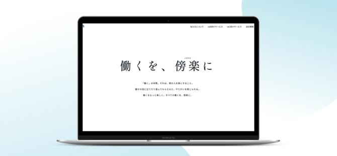 本質の追求を表現できるよう、TOPページはVisionである「働くを、傍楽に」を前面に押し出したシンプルなデザインにしました。また、「傍(はた)を楽(らく)にする」というキーワードが持つ柔らかく温かみがあるイメージを暖色の背景色や丸みのあるフォントで表現しています。