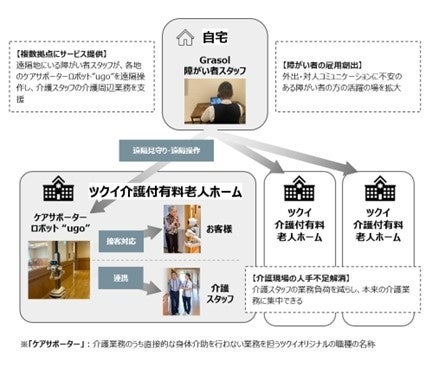 今回、ツクイグループが設立した、介護・福祉・医療領域に特化したファンド「ツクイ・ケアテック投資事業有限責任組合」で出資しているugoのアバターロボットがケアサポーターの業務の一部を担当し、人とロボットで介護周辺業務を分業し介護スタッフの業務負荷軽減を目指します。