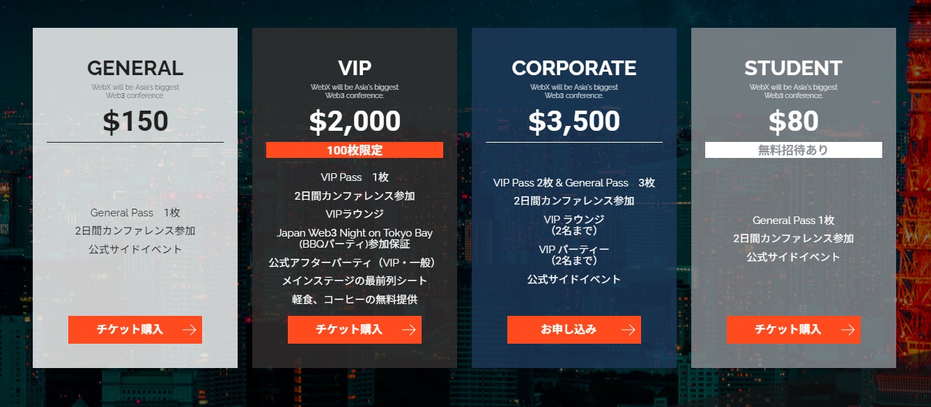 WebXでは、VIPチケット・Generalチケット・Studentチケット・Corporateチケットの4種類を販売いたします。「より多くの方々にWebXに参加いただき、Web3に興味を持ってもらう」ために、チケット価格は海外カンファレンスのチケット価格より大幅に低価格に設定しております。