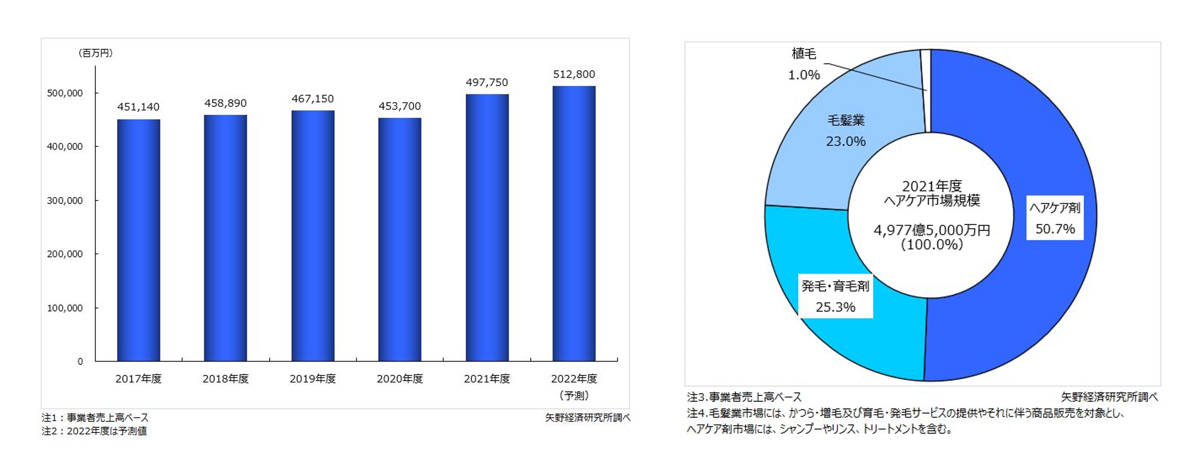 矢野研究所調べでは、日本のヘアケア市場は2021年度で4,977億円、そのうち「毛髪業(かつら・ウィッグ)」市場は、1,144億円(23.0%)と言われています。