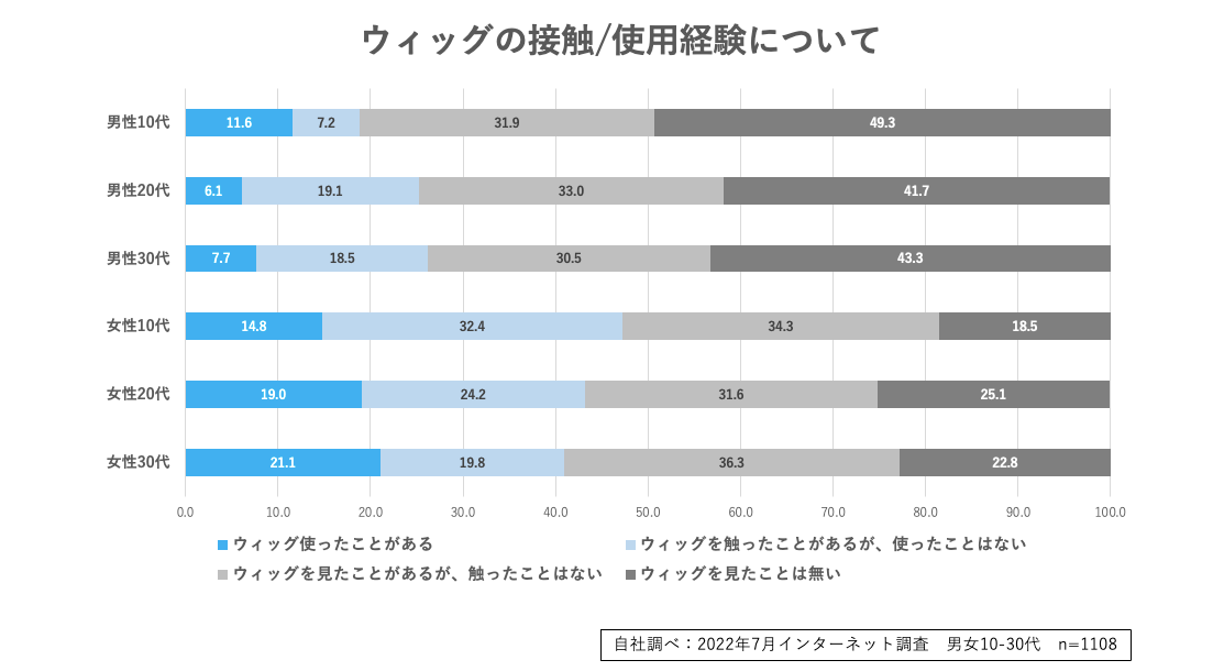 自社実施のアンケート調査では、特に男性の若年層において接触/使用経験が少ないことが明らかになっています。この状況を「ウィッグの興味喚起ポテンシャル」として捉え、今後のマーケティングを進めていきます。