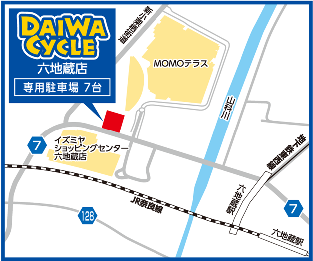 ダイワサイクル六地蔵店はJR奈良線・京都市営地下鉄 六地蔵駅から北西徒歩約5分に位置します。MOMOテラスの横、イズミヤ六地蔵店の前にあり、お買い物や通勤通学途中に空気入れや、お困りごとなど、気軽にお立ち寄りいただきやすい立地です。京都府道7号線(京都外環状線)に面し、7台の専用駐車場を備えており、お車でもお越しいただきやすくなっております。