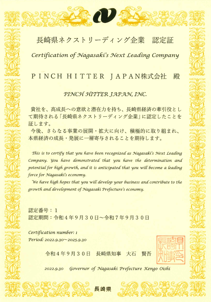 企業の滞留在庫を買取、再流通事業、事業そのものを買取、販売事業を展開しているPINCH HITTER JAPAN株式会社(本社:長崎県諫早市、代表取締役社長:吉岡拓哉、以下、当社)は長崎県より「ネクストリーディング企業」に認定して頂きました。